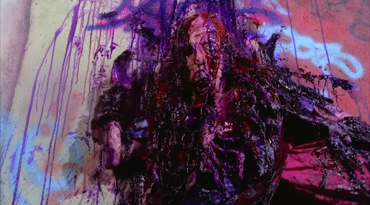 Street Trash, avec son concept débile, est rapidement devenu culte ! Simple, des clochards qui fondent en buvant un alcool sacrément fort. De quoi passer un moment fun et pas prise de tête. Malheureusement, certains films deviennent cultes juste pour une scène, ou tout simplement un concept. Frères de Sang de Frank Henenlotter m’avait pas exemple extrêmement déçu. Street Trash, c’est de la même vaine. Et limite, ça m’emmerde, car Jim Muro, qui n’aura au final été que caméraman sur de nombreux films avant de revenir à la mise en scène en 2013 avec des séries TV, fait un boulot franchement honorable. Dès les premiers instants d’ailleurs, l’ambiance est posée, les rues de New York sont crades, les personnages sont pour la plupart des enfoirés tous autant qu’ils sont, les meurtres sont gratuits, les femmes violées. Muro livre de beaux plans, parvient à cacher par instant son manque de budget, son métrage baigne dans une ambiance crade typique des années 80. Alors qu’est ce qui cloche ? Pas mal de choses malheureusement ! Pourtant tout commence bien, puisqu’après la scène d’ouverture, on entre dans le vif du sujet. Street Trash ne perd pas de temps, l’alcool Viper est en vente dans une petite épicerie, et va faire des carnages. Les premiers instants ne mentent pas sur le marchandise, et on comprend tout de suite que la pochette, qu’elle soit française ou américaine, ne mentait pas. Nous avons bien des clochards qui fondent dans des giclées multicolores totalement crades. Parfois, ils ne fondent pas et explosent littéralement.