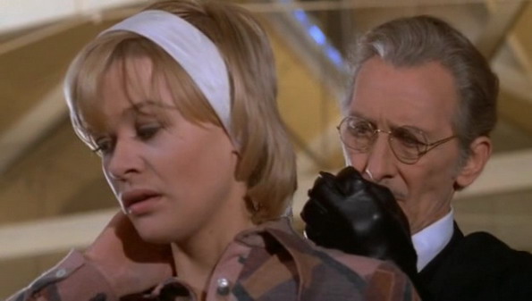 Peggy est seule chez elle, elle prépare ses valises lorsqu’elle se fait attaquer par un homme vêtu de noir, avec gants noirs. Sauf qu’en un éclair, l’attaquant prend la fuite après avoir perdu son bras gauche, une prothèse. Oui, on a l’impression de se retrouver devant un giallo, avec un indice pour deviner qui est le tueur (la prothèse), la façon de s’habiller, le mode opératoire. Seulement Sueur Froide dans la Nuit se fait bien trop prévisible, bien trop sage puisqu’il ne contient pas vraiment de meurtres, et manque la plupart du temps de rythme. Le film prend des allures passé le premier quart d’heure de huis clos à la campagne, Peggy rejoignant son mari qui travaille là-bas. Immédiatement, elle se dit que quelque chose cloche au fur et à mesure qu’elle rencontre les rares habitants du coin. Il y aura Molly, et son mari, le chef de l’école. Et puis basiquement, c’est tout, le film se déroule en huis clos avec quatre personnages. Bon point pour lui, les acteurs sont tous très bons. Judy Geeson dans le rôle principal parvient à être attachante et vulnérable dans le rôle de cette femme traquée, Ralph Bates livre une prestation tout à fait honnête dans le rôle du mari. Mais on retiendra surtout la prestation de Peter Cushing malgré son temps de présence à l’écran très réduit, ainsi que de Joan Collins dans le rôle de sa femme.