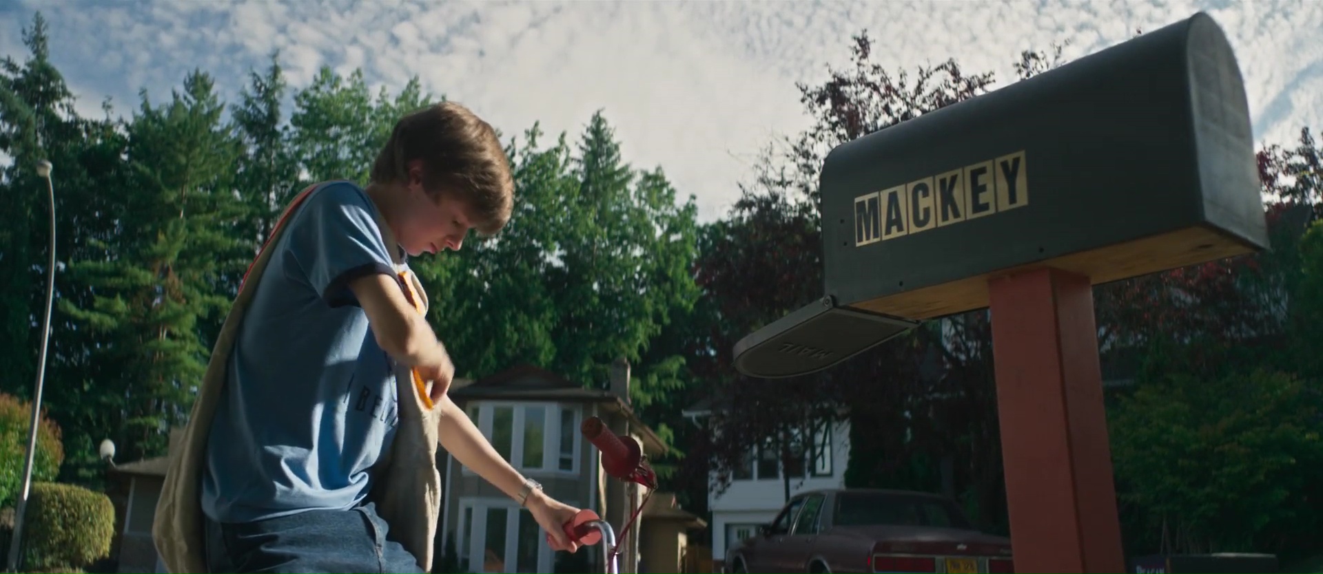 En tout cas, dés les premiers plans, inutile de le nier, Summer of 84 rappelle immédiatement les productions Spielberg, avec sa bande de 4 collégiens, et nous rappelle que les réalisateurs aiment vraiment les BMX, comme ce fut le cas déjà dans Turbo Kid. Cerise sur le gâteau, Le Matos, qui signait déjà la superbe bande son du dit film, revient et livre une OST franchement encore une fois excellente, bien que différente. Car si Summer of 84 contient de l’humour, parfois beaucoup, il n’est pas franchement une comédie. Davey, le personnage principal, jeune adolescent de 15 ans faisant parti de la bande de potes, soupçonne le voisin d’en face, policier, d’être le tueur en série qui kidnappe et tue des enfants. La bande va alors tout tenter pour découvrir si Davey a raison, et trouver des preuves. Le film va alors alterner quelques moments de la vie quotidienne des quatre garçons (jusqu’à nous montrer des moments plutôt réalistes et rares dans ce genre de films, où la sexualité de ces très jeunes adolescents est mise en avant, là où en général, le cinéma Américain n’en parle que lorsque les personnages sont de jeunes adultes (American Pie et compagnie), jamais avant), et l’enquête de nos jeunes pour découvrir si oui ou non monsieur Mackey est un tueur en série. Et dés le début, le film parvient par une petite voix off à quelque peu nous montrer le vrai thème du film, et du coup à justifier intégralement le pourquoi les années 80. Oui, le film veut égratigner la petite bourgade Américaine, nous montrer que les petites banlieues tranquilles sont souvent les endroits où le pire arrive (en ce sens, le propos peut rappeler Blue Velvet de David Lynch). Et quand on y pense, le milieu des années 80, ce sont les années où le rêve Américain a commencé à se briser, où la réalité a rattrapé le peuple et fait comprendre que non, les petites bourgades tranquilles ne sont souvent pas mieux que les grandes villes. Car derrière les rideaux fermés de votre voisin, le pire peut parfois arriver.