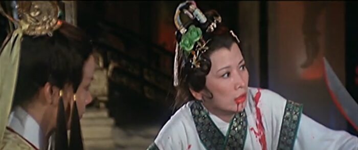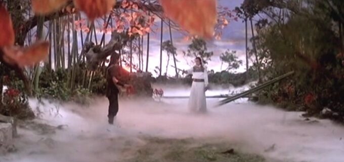 Les décors se montrent au départ particulièrement sobres, pour du Chu Yuan. Des compositions tout d’abord assez foisonnantes, remplissant le cadre de tout un tas de choses très artificielles qui feraient passé le lieux pour une maison de poupées. Chu Yuan s’amuse énormément à obstruer la vision en planquant sa caméras derrières des branchages, mais aussi en jouant avec les flous. Un beau moyen de donner un ton assez bordélique à l’ensemble. Ne soyons pas médisant, il arrive malgré tout à donner de belles images, avec de belles teintes, qui transpirent le tournage en studios.