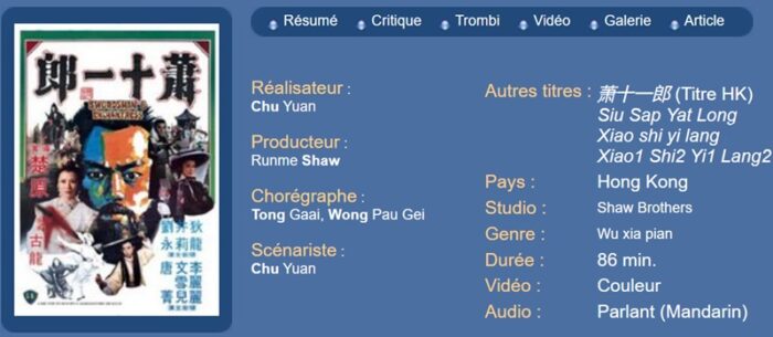 Forte d’une filmographie impressionnante de plus de cinquante films, Cheng Lee termine sa carrière en beauté avec Shaolin VS Wu Tang, un film d’art martiaux réalisé et chorégraphie par Liu Chia Liang.