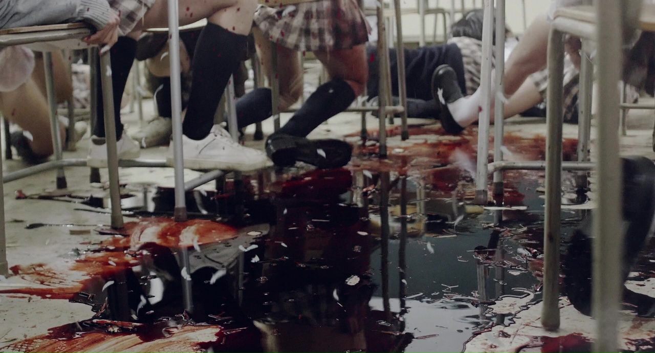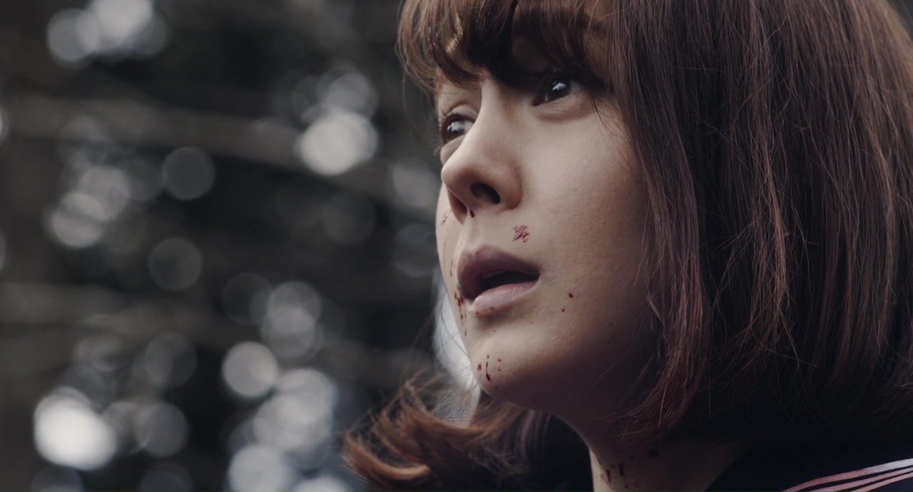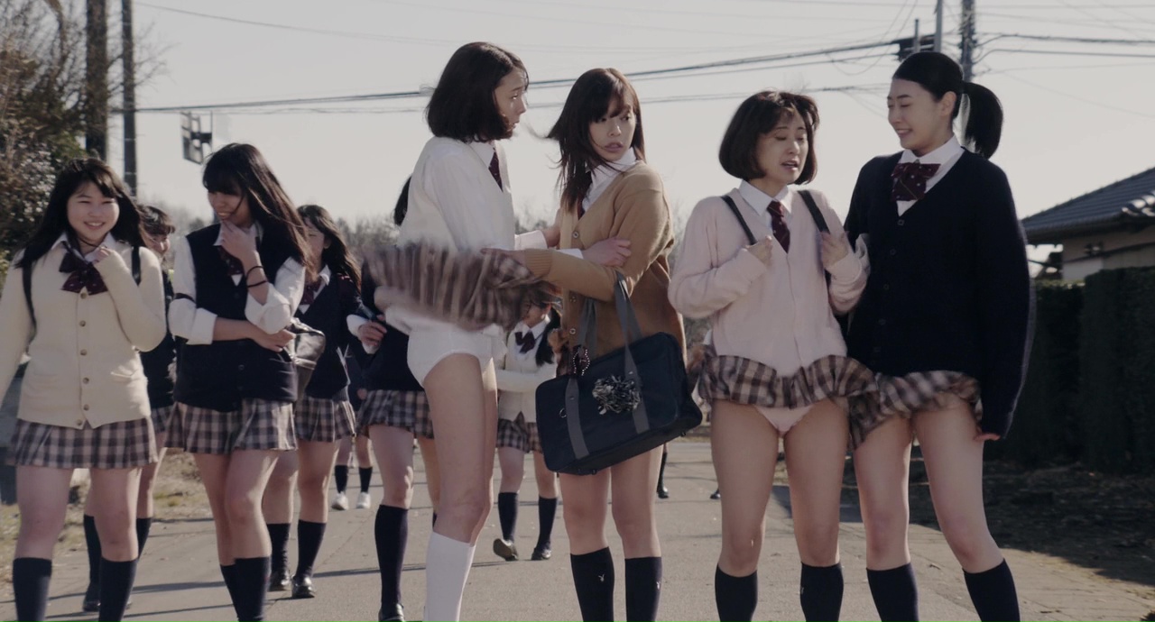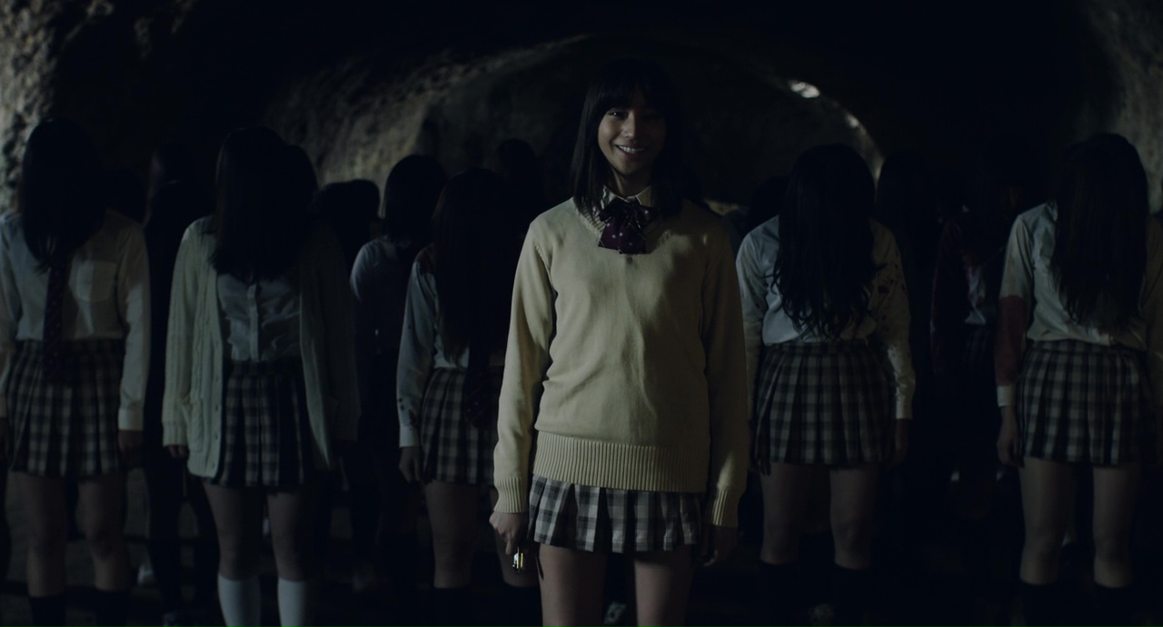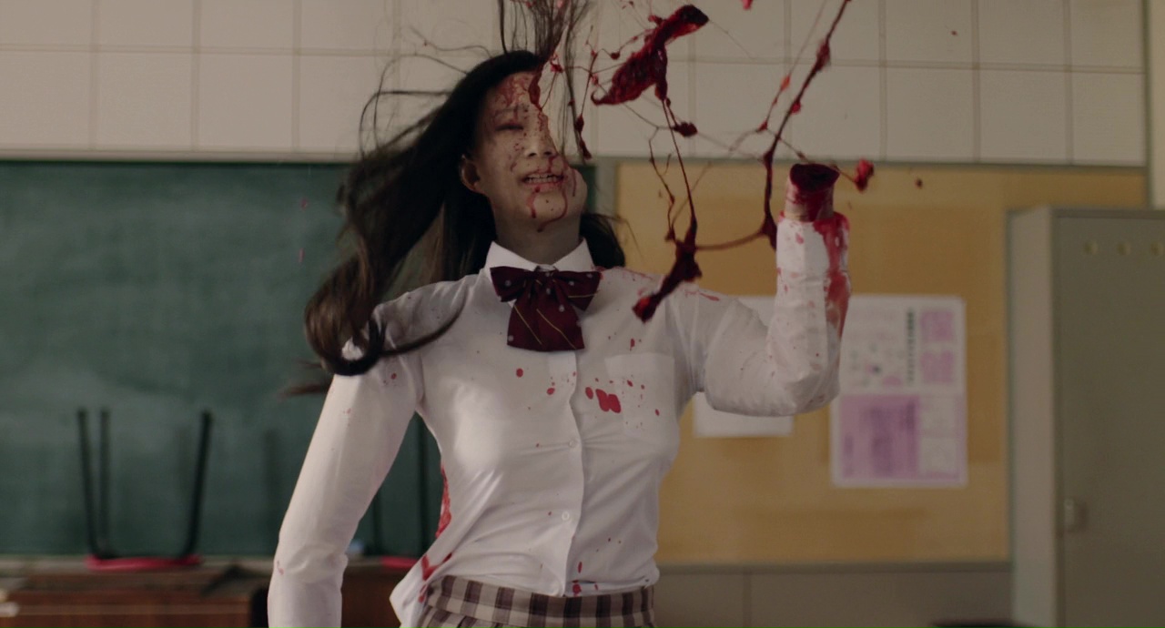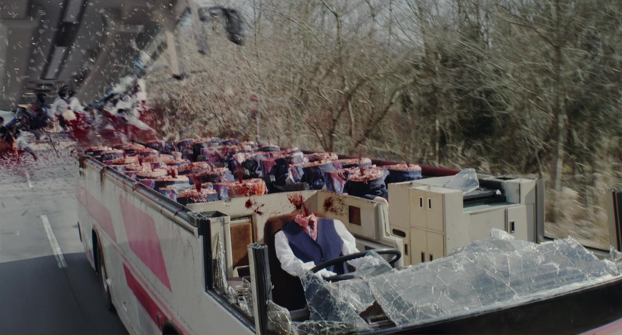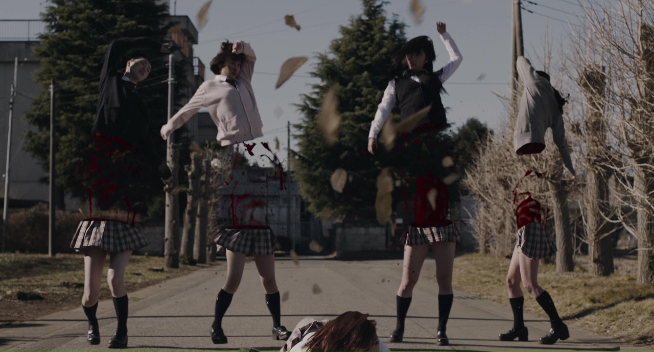 L’histoire, de base, nous parle des personnes dont le nom de famille est Sato se faire attaquer. Bon, Sono Sion vire tout ça, et à la place, se sont juste des lycéennes aux petites culottes apparentes qui se font décimer dans la joie et la bonne humeur. Le film commence fort d’ailleurs, puisque deux minutes en mains, et voilà que deux bus entiers sont décimés, plus quelques passants, pour le fun ! Directement, on constate diverses choses. Triendl Reina (Ju-On : The Beginning of the End) joue très bien, c’est un fait. En plus d’avoir un certain magnétisme à l’écran, elle passe parmi plusieurs émotions, de la joie à la peur avec aisance, et porte le film, du moins une partie du film, sur ses épaules. On remarque également que le film se fait généreux. On ne perd pas de temps et paf, une trentaine de morts d’un coup.