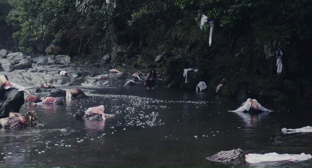 La mise en scène de Sono Sion se fait élégante, souvent posée, avec beaucoup de plans filmés en drone, et cela donne un aspect très poétique au métrage. Bien loin de ce que l’on pouvait attendre du métrage. Car oui, Tag n’est absolument pas le film que l’on pouvait attendre. On nous vendait un carnage non stop à la Battle Royale ? Et bien non, Sono Sion s’en amuse et découpe son film en trois (voir plutôt quatre) parties. Le carnage, l’action, ce sera au début, dans les deux premières parties, le reste se faisant finalement beaucoup plus posé. Mais jamais ennuyeux, puisque Tag est un film extrêmement bien dosé. Et bien qu’étant de base une œuvre de commande, on remarque dés les premiers instants, et cette impression se confirme au fur et à mesure, que le métrage est finalement, dans son propos, beaucoup plus personnel qu’on ne le pense. Oui, les trois personnages principaux sont Mitsuko, Keiko et Izumi, des noms déjà utilisés pour les premiers rôles d’œuvres antérieures de Sono Sion. Trois femmes qui passent leur temps à courir, trois femmes qui ne sont qu’une seule femme. Tag n’est finalement que le chemin d’une femme, qui va courir, sans arrêt, pour sa vie, mais aussi pour grandir, pour apprendre à se connaître, apprendre à se défendre, à s’assumer, à s’accepter. On rapprochera pour le propos le film au chemin de la femme de Guilty of Romance, bien que le genre abordé est bien évidemment totalement différent, et que Tag se fasse finalement beaucoup plus accessible.