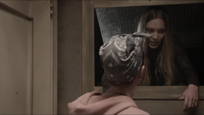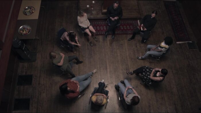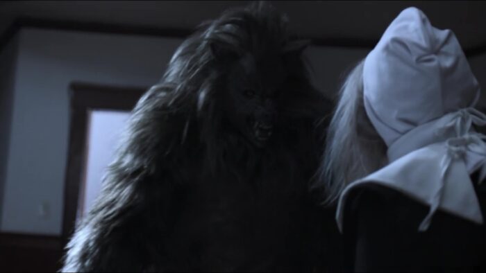 Un sérieux pour nous raconter une histoire plus ou moins construite, déjà. Mais aussi, si le budget est bas, voire très bas, on se dit qu’au moins, l’argent a été mis pour rendre le loup-garou plus ou moins crédible. Attention, on voit clairement que c’est un mec en costume, mais entre le montage qui ne nous le montre pas non-stop, et un costume qui pour un film low budget est, en soit, plutôt réussi, il y a bien pire ailleurs. Au moins, pas de CGI, pas d’abus en filmant la créature frontalement en grand-angle toutes les minutes. On sent que le réalisateur et scénariste Thomas J. Churchill voulait bien faire. Il n’a peut-être pas forcément le talent, et ça se remarque surtout dans les scènes extérieures, souvent très moches (sans parler des plans en noir et blanc quand le personnage se rappelle de certains éléments que le spectateur a déjà vu, et qui sont d’une laideur sans nom), mais il essaye. Il veut rendre son loup crédible, il veut créer un mystère crédible, et parfois, à de rares occasions, il tente des choses au niveau des plans choisis, comme pendant cette session de groupes et ce plan en contre-plongée. Anéanti l’instant suivant par un montage particulièrement maladroit, mais bon. Mais finalement, il y a pas mal de défauts, on arrive à les pardonner, en prenant le film pour la minuscule production qu’il est. Ajoutons d’ailleurs que le casting est loin d’être honteux pour une fois par exemple, avec certains acteurs plutôt crédibles, et une petite curiosité qui se glisse au casting avec la présence de Tuesday Knight en bonne sœur. Je ne l’avais pas vu sur un écran depuis sa participation à l’opus 4 de la saga Freddy, et j’avoue que ça m’a fait plaisir.