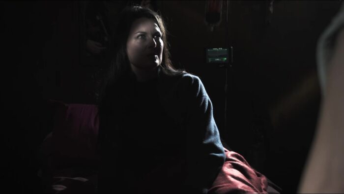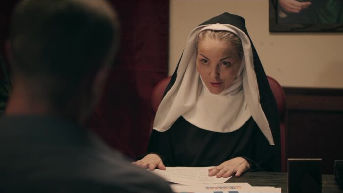 Mais The Amityville Moon, en plus d’être bien moche visuellement, se retrouve avec un défaut qui lui est plus difficile à pardonner. Il est bavard, mais à un niveau qui rend l’aventure ennuyante. Sans doute là aussi car le réalisateur croyait à son intrigue et à ses personnages, sauf que souvent, ça se pose dans des bureaux et ça discute pendant des plombes. Entre notre détective et un collègue, puis avec la bonne sœur pendant des plombes, avant que le prêtre n’arrive et ne prenne la relève, et ainsi de suite, et l’enquête du coup, elle patine, sans que les quelques nouveaux éléments ne viennent nous réveiller. C’est juste inutilement long pour pas grand-chose, pour faire trainer l’enquête. Vouloir donner de la profondeur à ses personnages, c’est bien, mais soit ça coince au niveau du texte, soit la mise en scène ne parvient jamais à dynamiser quoi que ce soit. Le résultat, il est laborieux. On en viendrait à regretter que le fameux loup ne soit pas plus présent du coup. On aurait eu une série B à tendance Z totalement bancale et fauchée, mais divertissante et attachante avec cette envie de bien faire. Car oui, tout n’est pas à jeter, mais il faut parvenir à ne pas s’endormir devant pour y décerner ses qualités.
