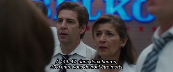 C’est un des problèmes du film. On sait d’entrée de jeu qui seront les gentils (ceux qui interprètent habituellement des gentils) et qui seront les méchants (ceux qui interprètent habituellement des méchants). Il n’y a quasiment aucune ambiguïté sur la personnalité de certains et, clairement, l’ensemble du film manque d’originalité. Pas ou peu de surprises, ni même sur les différents messages du film. L’homme est un loup pour l’homme lorsque les règles tombent donc, comme dit plus haut, avec les plus bas instincts primaires de l’homme qui ressortent, ceux qui vont tenter de survivre, ceux qui vont tenter de fuir, ceux qui vont immédiatement paniquer et à l’inverse ceux qui vont rester calmes et essayer de trouver une solution. Avec cette frontière entre le bien et le mal devenant de plus en plus mince lorsque la nature humaine reprend le dessus. Mais également cette métaphore sur le Capitalisme, où les puissants vont logiquement s’allier aux puissants pour écraser les plus faibles.