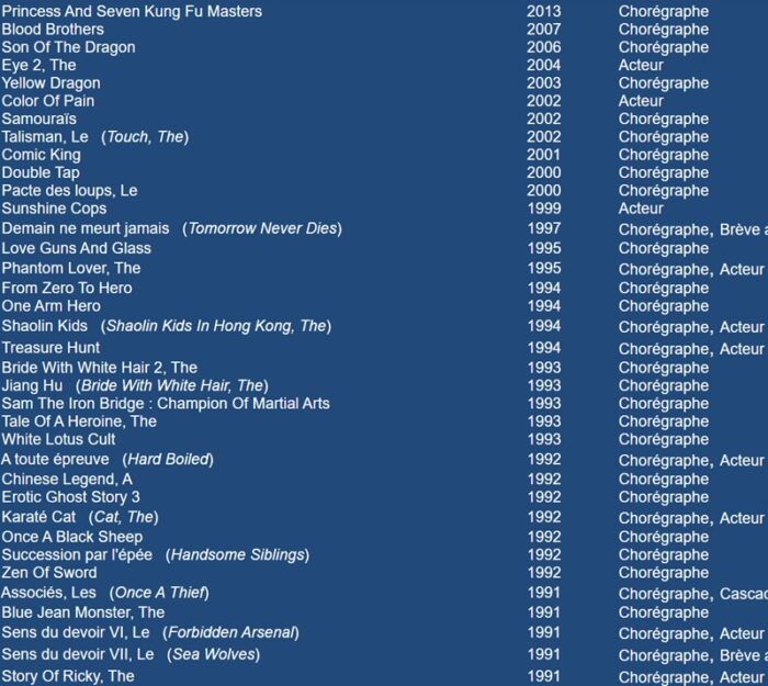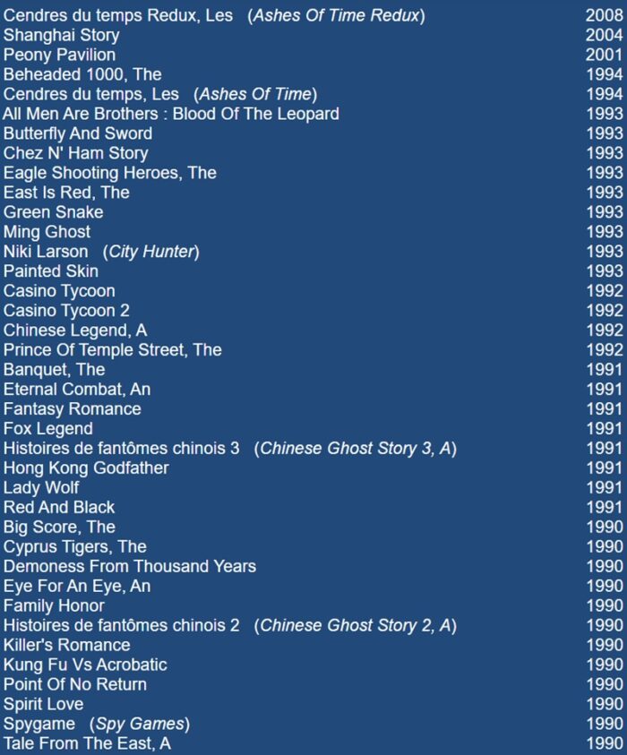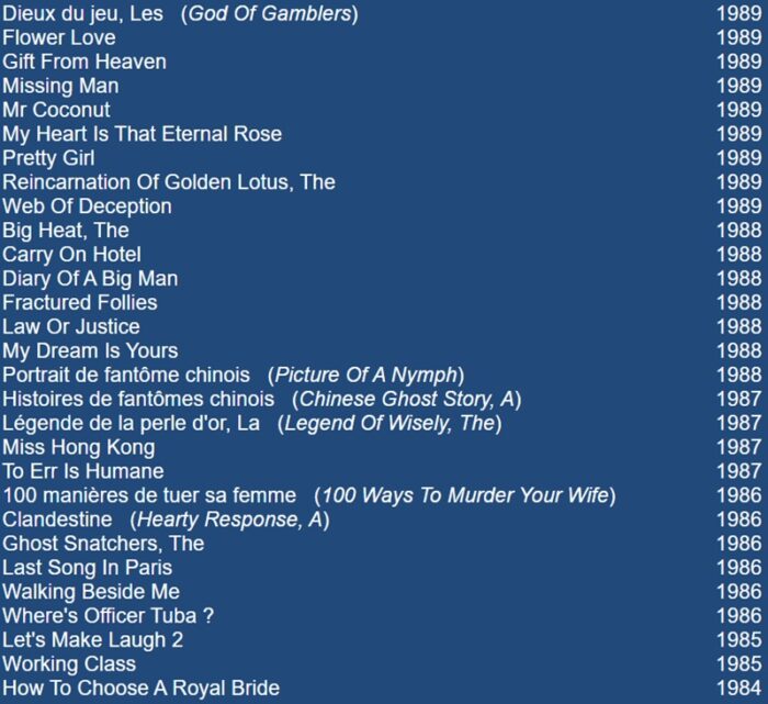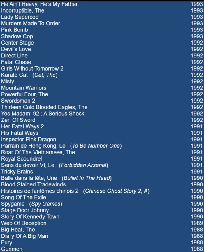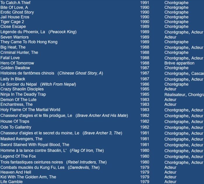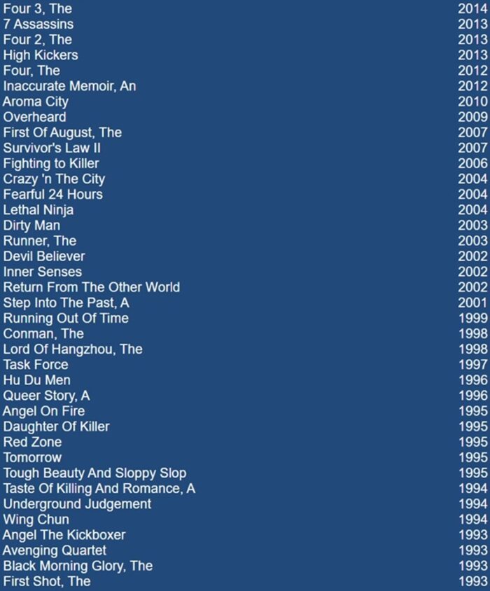Après cela, la Film Workshop l’engage dans de nombreuses autres productions du même type (un flic blessé à la main dans Big Heat, l’un des incorruptibles de Gunmen). On le retrouve également dans des rôles de sabreurs invincibles comme dans A Chinese Ghost Story 2 (Histoires de fantômes chinois II) et Swordman 2.