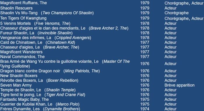 Au milieu des années 70, il devient cascadeur dans les films de Chang Cheh avec Alexander Fu Sheng. C’est en voyant ses potentiels acrobatiques et sa réelle prestance dans Shaolin Avengers que Liu Chia Liang le pris dans son prochain film Marco Polo en 1975 (dans un rôle figuratif). Ca y est, sa carrière d’acteur était lancée ! L’un de ses personnages fétiches restera sans doute à cette époque l’un des cinq animaux venimeux (les Five Deadly Venoms en VO).