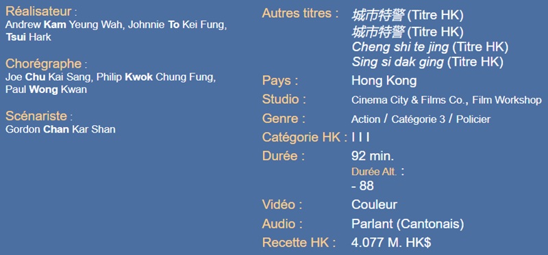Lorsqu’en 1988, Tsui Hark produit ce petit polar au casting relativement peu reluisant, il ne s’attendait certainement pas à ce que le tournage de celui-ci se révèle pour le moins bordélique. Cela tombe bien, l’oeuvre en question l’est tout autant. Mais comme le cinéma de Hong Kong sait se révéler particulièrement doué pour faire de bonnes choses avec tout et n’importe quoi, le résultat aboutira à une oeuvre plutôt réussie, qui n’hésite pas à aller au bout de ses idées.