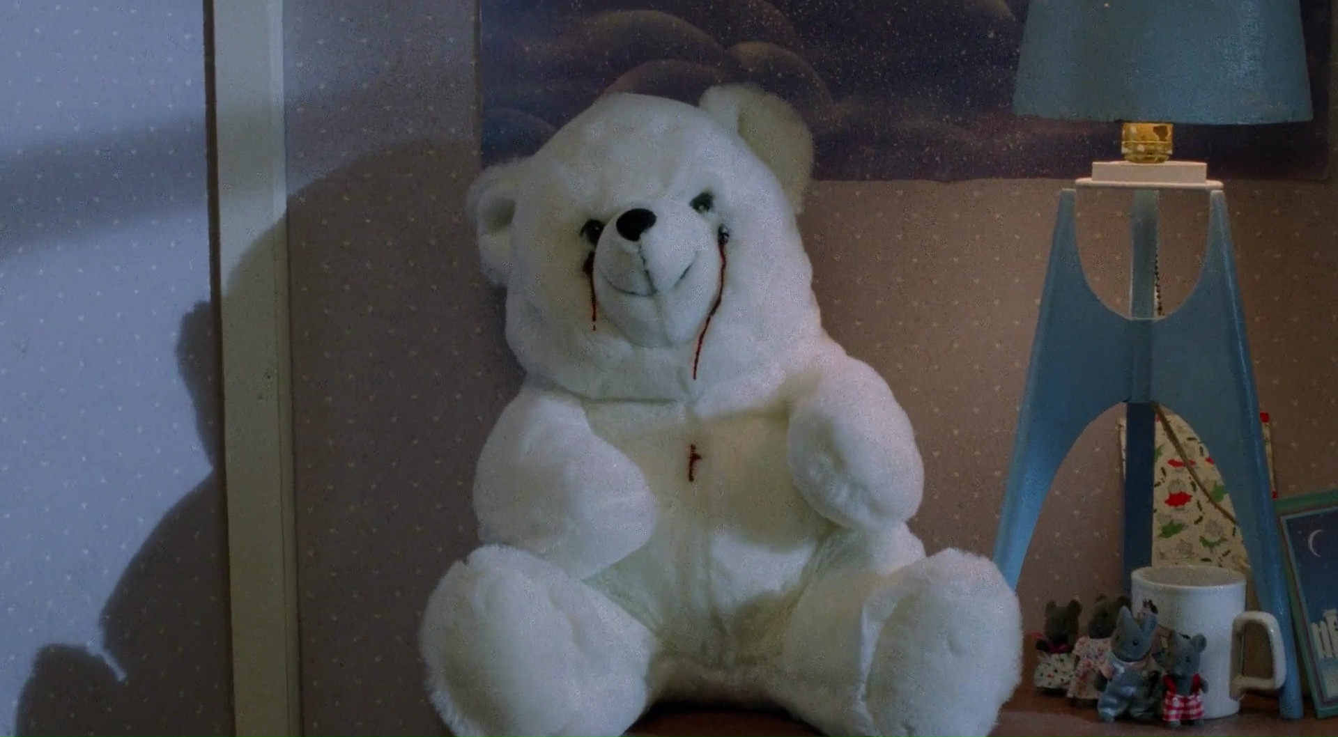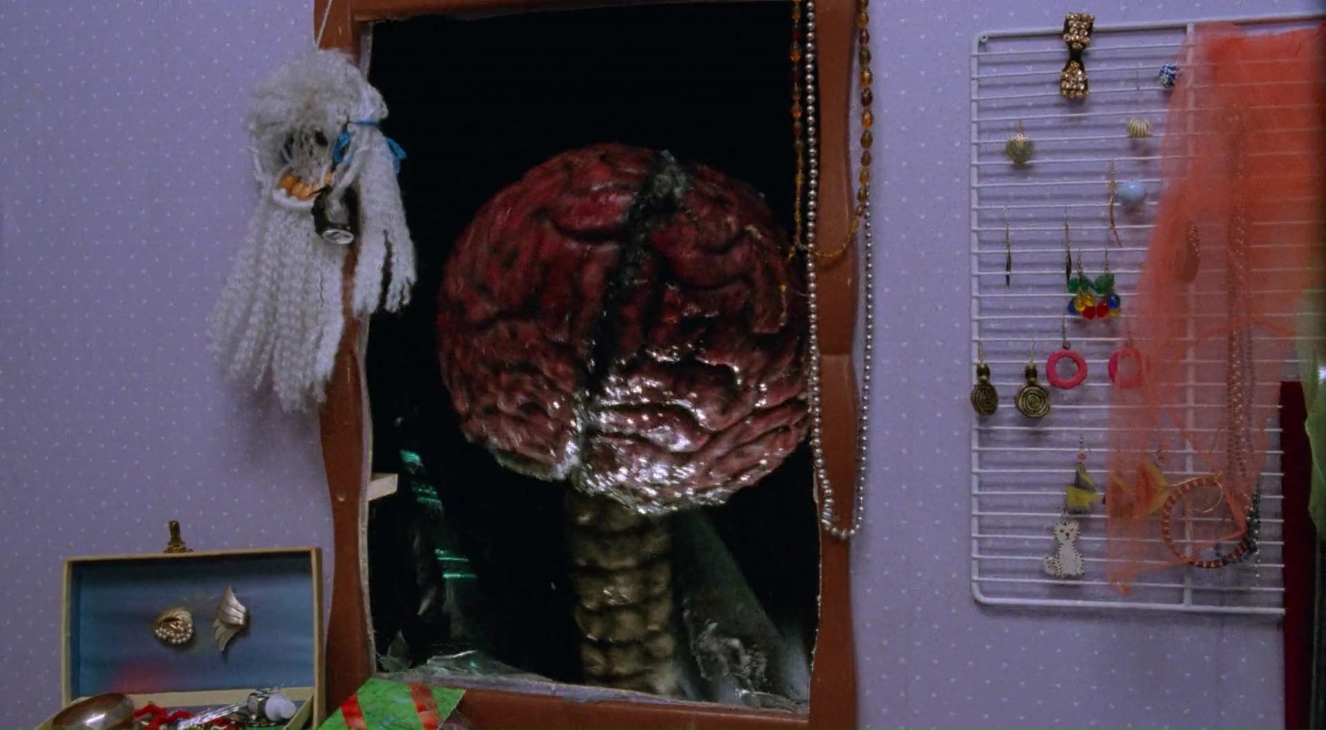 Entre hallucinations, docteurs fous qui le poursuivent et n’hésitent pas à éliminer des témoins à gros coups de haches dans la face, et un fameux cerveau géant se nourrissant des pensées des gens et grandissant à vu d’œil, jusqu’à avoir une tête carrément, il faudrait être bête pour ne pas se rendre compte que quelque chose cloche. Surtout lorsque l’on voit notre docteur arriver vers nous intégralement nue. Et contre toute attente, malgré un budget sans doute bien bas, The Brain fonctionne et s’avère une très solide série B. Il faut dire que le film déborde de bonnes intentions, et parfois d’idées visuelles forts sympathiques. Tout n’y est pas parfait, mais on va y revenir. Car ça commence fort en tout cas, avec une séquence d’hallucination, cash en ouverture, à coup d’ours en peluche prenant vie et pleurant du sang (du Fulci pour ours en peluche ?), murs d’une pièce qui rétrécissent, et tentacules géantes traversant les murs (non, ce n’est pas un hentai). Ça commence fort, si bien que la suite, un brin plus classique, a de quoi décevoir. Oui, notre héros, il est bien classique, il a son intérêt amoureux qui parfois est un peu cruche (mais le héros aussi je vous rassure). Tardivement dans le film, notre héros dira clairement à sa copine de ne pas regarder la télévision pour ne pas se faire laver le cerveau, et cette cruche, elle finira par le faire, et notre héros se demandera pendant de trop longs instants ce qui aurait bien pu se passer… Des petites erreurs, dans les personnages classiques ou un peu trop transparents (le docteur joué par David Gale) un peu trop en arrière plan, dommage), avec des acteurs pas toujours au top, ou parfois même dans sa narration, mais qui ne retire en rien au plaisir du visionnage.