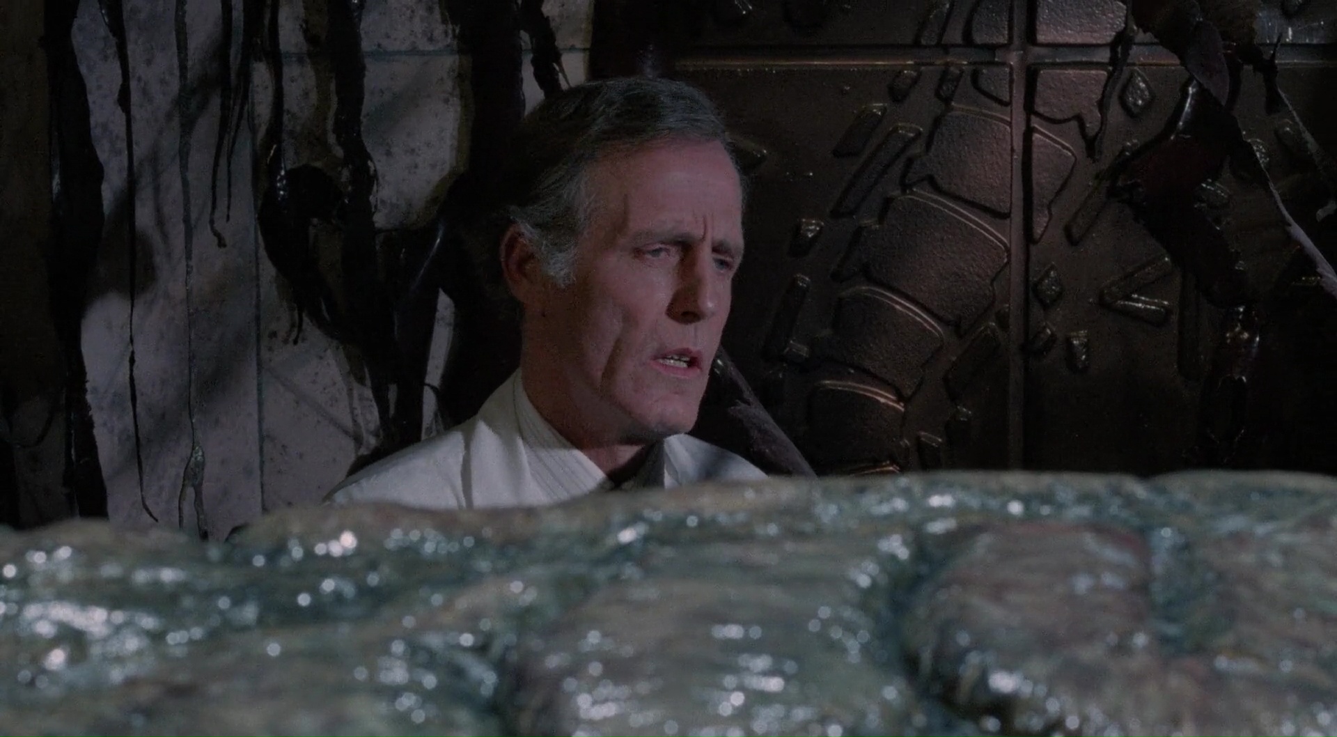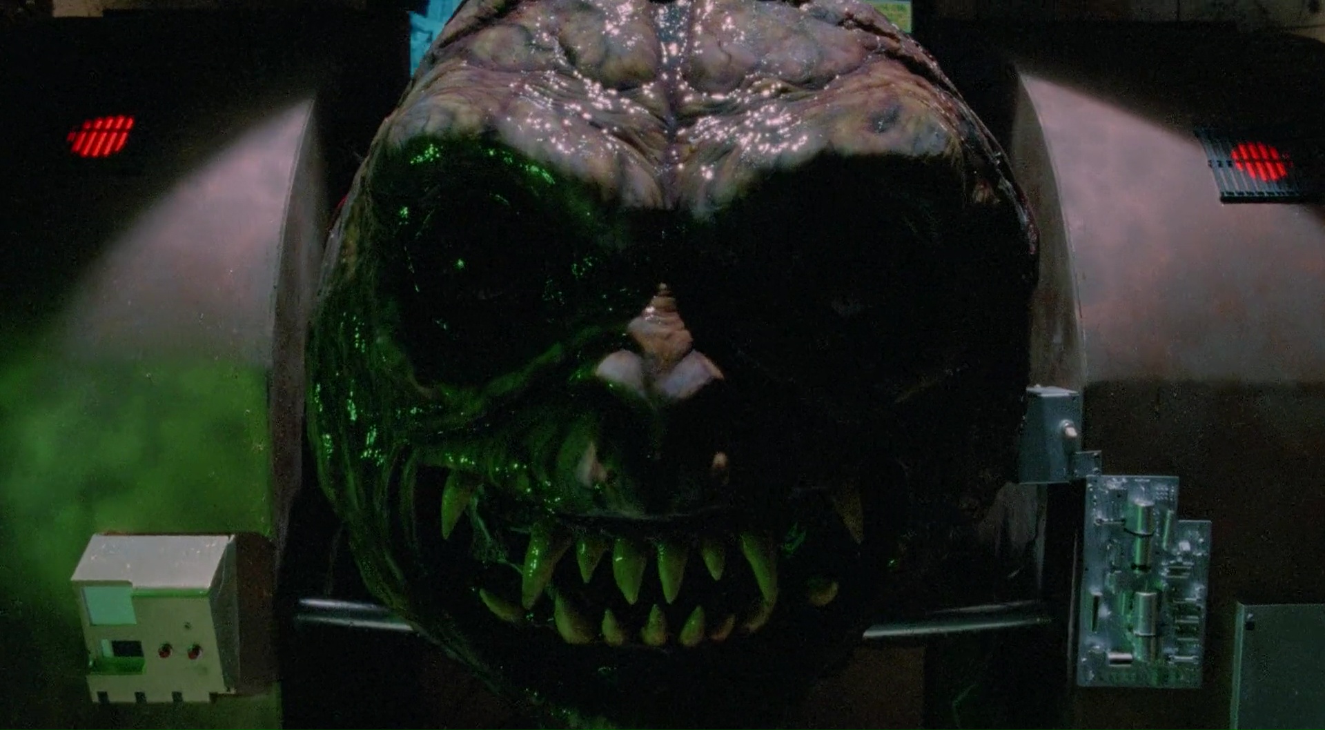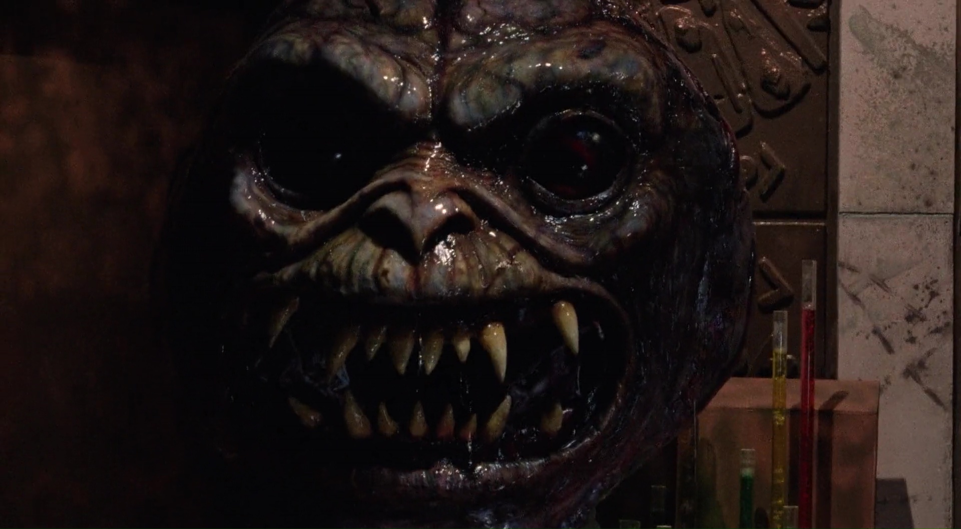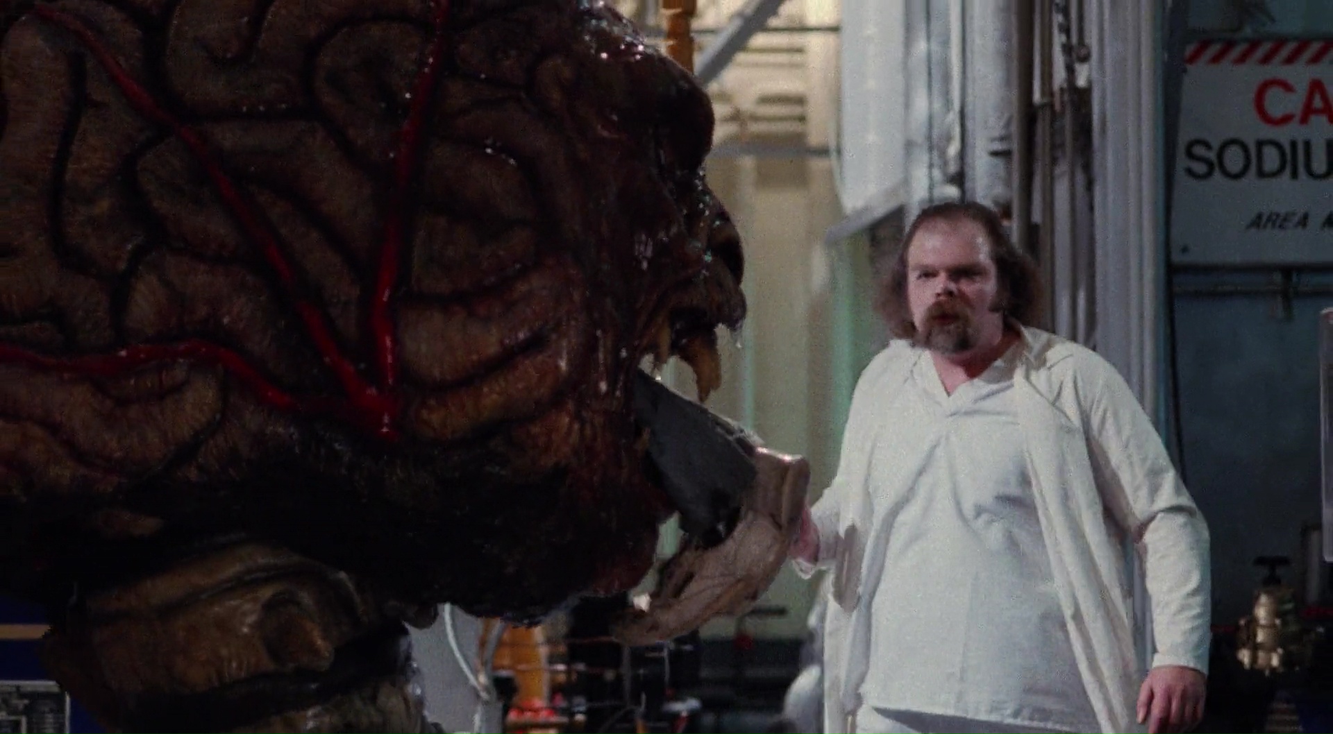 The Brain, je dois bien avouer que je n’en avais jamais entendu parler. Merci donc à Shout Factory d’avoir édité ce titre méconnu aux States dans une magnifique copie HD. Donc, The Brain. Film coproduit entre le Canada et les Etats Unis en 1988, il s’agît d’un film de Ed Hunt, réalisateur plutôt méconnu par ici, mais qui a déjà une petite carrière dans le genre. Il avait signé par exemple en 1981 Les Tueurs de L’Éclipse (Bloody Birthday), très sympathique bobine, sur laquelle il collaborait déjà avec le scénariste Barry Pearson. Pas parfait, mais un film de gamins tueurs, avec une ambiance sympathique, je valide. Oui je suis comme ça, je n’aime pas les gosses de toute façon. Pour The Brain donc, c’est une toute autre histoire, puisque le duo de réalisateur et son scénariste ne livrent pas une bobine d’enfants tueurs, mais une série B un peu rentre dedans qui semble continuer des thèmes tels que ceux abordés par Cronenberg sur Videodrome. Le contrôle de l’esprit via la télévision, tout ça tout ça. D’ailleurs, en sortant de la vision, je me suis demandé ce que le film aurait été si Cronenberg l’avait réalisé, mais c’est une autre histoire. Car bien que série B sympathique, The Brain demeure une simple petite série B, parfois un peu fauchée et maladroite malgré pas mal de bonnes intentions. Par contre, il est assez amusant de voir au casting du métrage David Gale, qui après avoir voulu contrôler des corps réanimés dans le fameux Re-Animator de Stuart Gordon à coup de lobotomies, se retrouve encore ici à jouer le docteur qui cherche à contrôler l’esprit des gens. Mais ce coup-ci, avec l’aide d’un cerveau géant Alien, qui en plus bouffe le casting, rien que ça. On nous invite ici à suivre les aventures d’un jeune anti héros, farceur, avec de mauvaises notes en cours (comme dans un certain Le Blob datant de la même année), qui alors qu’il est envoyé au centre du docteur Blakely, va très rapidement comprendre que quelque chose cloche.