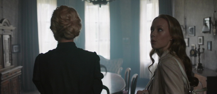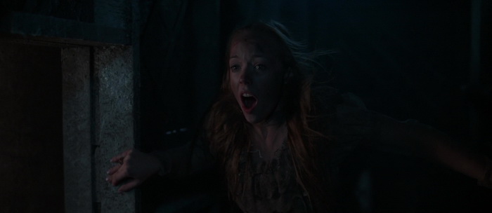 Et nous avons raison. Malgré tout, il serait dommage de descendre le film pour ça. Car durant toute la première heure en tout cas (sur 1h33), ça fonctionne bien. Les acteurs font du bon boulot, la mise en scène est soignée et sait mettre en valeur son cadre avec l’utilisation d’un magnifique format score, et l’ensemble bénéficie en plus d’un très bon montage pour rendre le tout fluide. La musique d’ambiance se fait discrète et accompagne bien les images, les effets spéciaux sont plus que corrects, et mieux encore, le film baigne de manière générale dans une esthétique très réussie grâce à la sublime photographie. On distingue très rapidement les influences diverses du titre, notamment Américaine (les jumpscares, la composition du cadre), Italienne (un paquet de clin d’œil à Fulci, notamment Frayeurs) et Japonaise (la mise en avant de son monstre, sa présence dans le cadre, jusqu’à certains gimmicks comme la descente d’un escalier à quatre pattes). Le souci, c’est que si ça fonctionne durant la première heure, notamment grâce à une économie de moyen et une certaine modestie dans les effets de styles (malgré la mise en scène et photographie ultra léchées hein), où le connaisseur sourira devant les influences voyantes, dés lors que le film s’emballe, il ne semble plus du tout digérer ses influences et se lâche totalement dans une dernière demi-heure des plus ratées. Et ça c’est dommage. Pendant la première heure, même si certains éléments sont gros et prévisibles (la bague, la famille étrange), ça fonctionne, et on se prend au jeu, perdant parfois nos repères comme Nastya qui alterne rêves et réalité. Enfin, rêves de flashbacks et réalité. Il faut dire que pour peu que l’on aime ce à quoi le film nous renvois, le tout étant très bien filmé, la sauce prend.