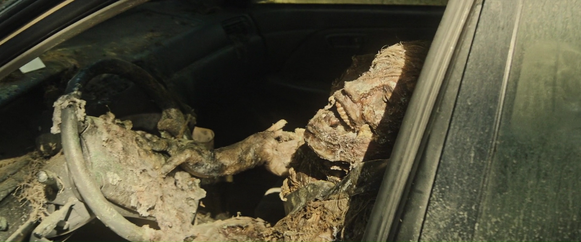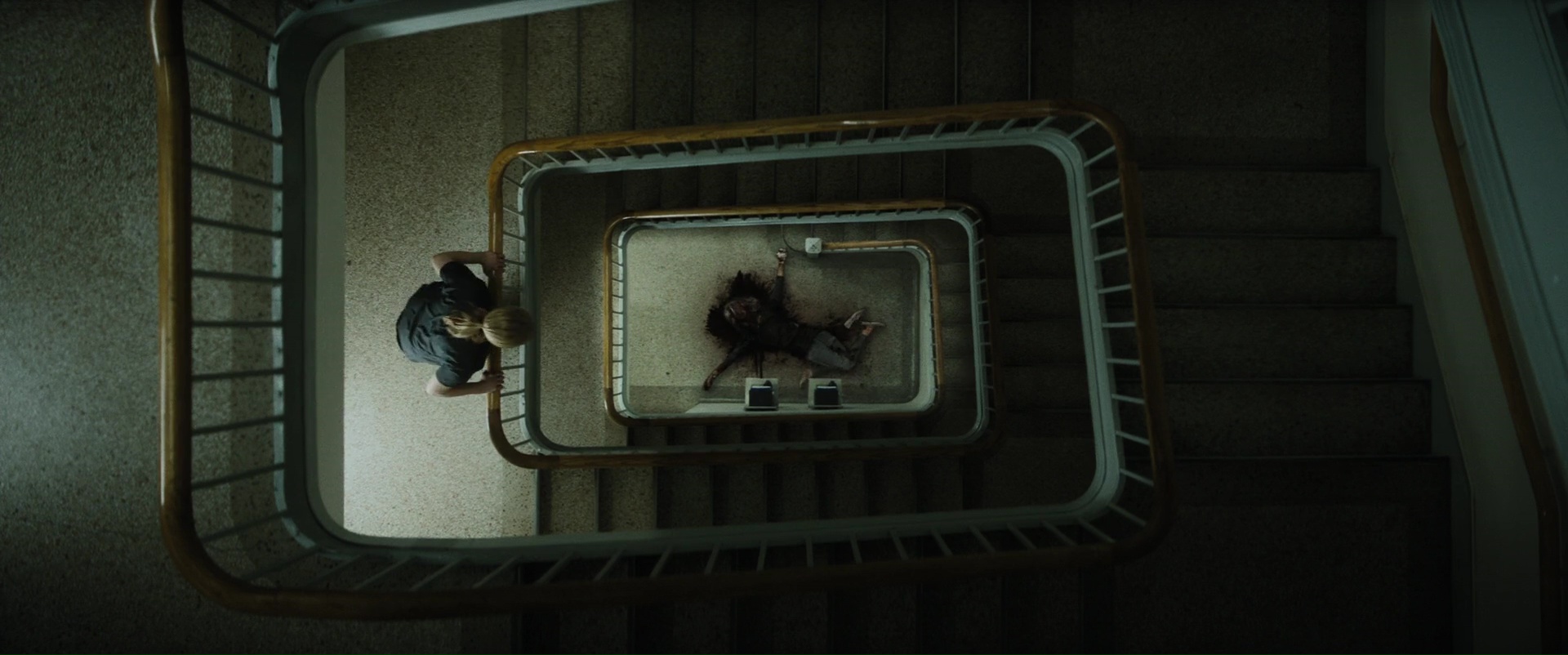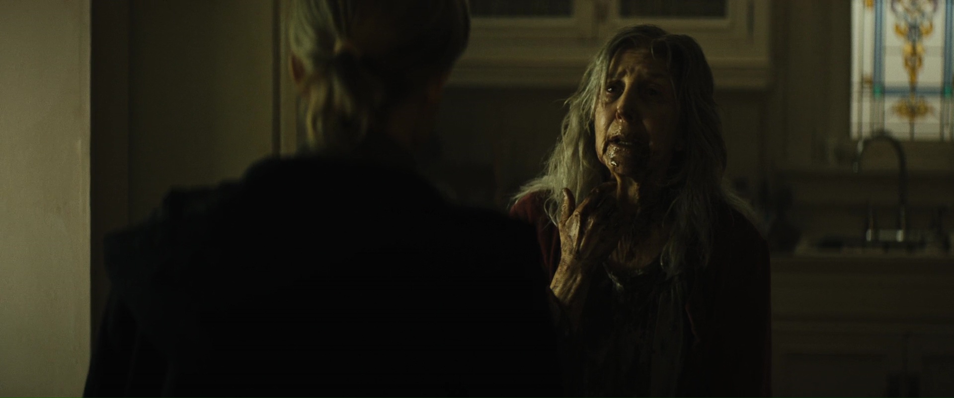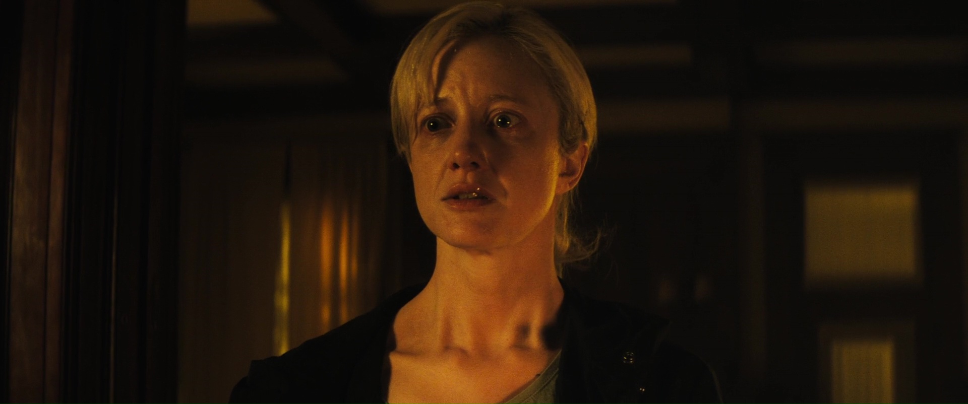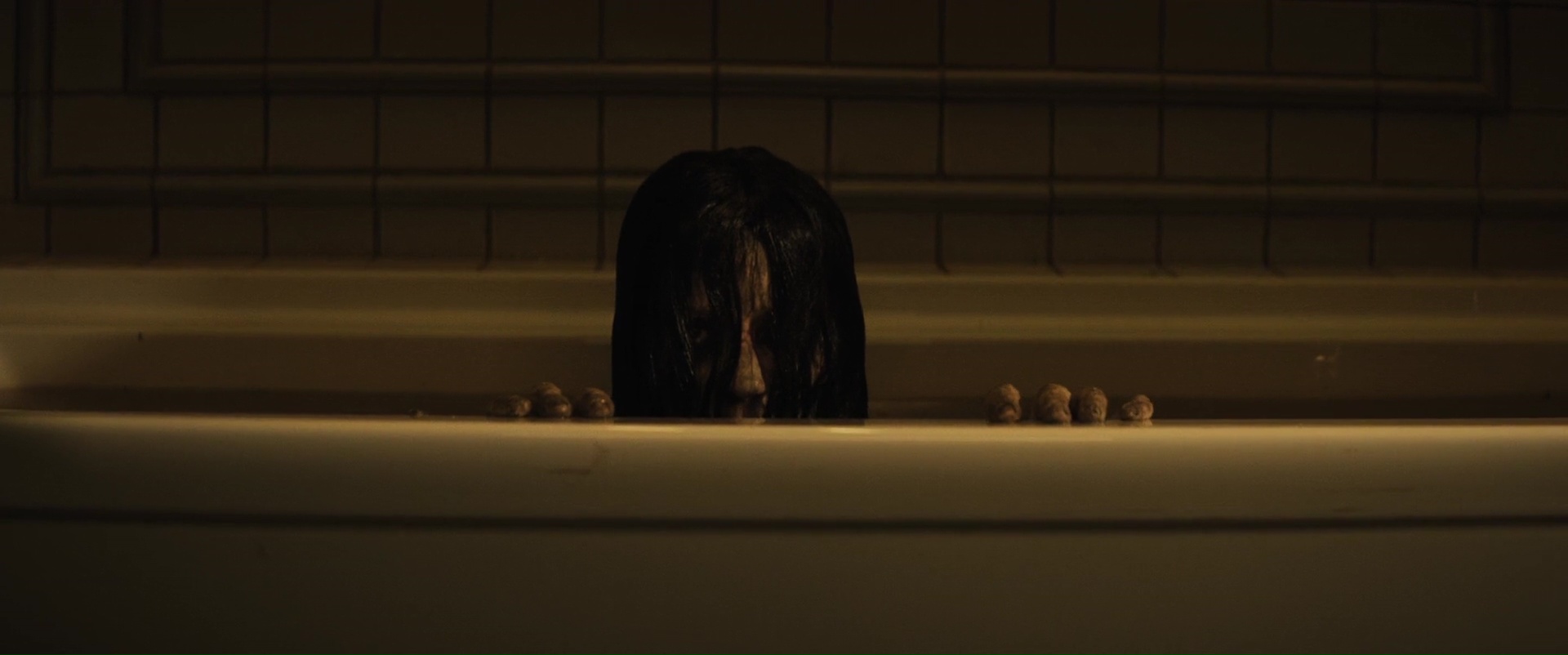 Mais ça, c’est dans le fond hein. Dans le fond d’ailleurs, il apporte une idée. Une seule oui, mais une idée intéressante. Celle d’amener la saga The Grudge dans le domaine des films dépressifs. Tous les personnages semblent dépressifs. Entre le mari qui croit sa femme folle et veut l’euthanasier, le détective à bout qui finit à l’hôpital psychiatrique, la femme enceinte qui risque de refiler sa maladie à son bébé. Et visuellement, Nicolas Pesce a du demander à son directeur de la photo de respecter ce choix, tant le film baigne dans des tons gris/marrons qui semblent eux aussi dépressifs. Mais malheureusement, ça aussi c’est dans le fond. Dans la forme, dans le film, ça coince déjà plus. Donc avant de défoncer le film comme il se doit, un rappel rapide des qualités du métrage : il y a un bon casting. Voilà, c’est fait. Andrea Riseborough dans le premier rôle pour un film dépressif, forcément, ça le fait, tant ses choix de carrière en font une femme à part (Mandy, Possessor). À ses côtés, John Cho, excellent acteur capable de sortir de sa zone de confort (Star Trek, Searching, Total Recall, Harold et Kumar), Lin Shaye que l’on connait surtout récemment pour les Insidious, Jacki Weaver (Pique-Nique à Hanging Rock, Animal Kingdom, The Disaster Artist) ou encore William Sadler (Die Hard 2, La Ligne Verte, The Mist, Iron Man 3). Du tout bon au casting. Maintenant, le gros problème, c’est que tout le reste, ça coince. L’envie de mettre plusieurs temporalités dans le film, en même temps, c’est bien, ça respecte les origines de la saga, mais c’est bancal, on passe d’une histoire à une autre sans pouvoir s’attacher à tel ou tel personnage, ça casse le rythme. Rappelons qu’à l’origine, Ju-On, c’était désordonné oui, mais chaque chapitre correspondait à un personnage, et donc, à une mort, avant que l’on ne passe à autre chose. Ici le montage passe d’une intrigue à une autre un peu au pif, sans logique, juste histoire de. C’est déjà un gros souci, qui m’aura sans doute coûté ma tasse de café durant la vision, et les griffes de mon chat dans les jambes car elle aussi semblait s’ennuyer. Mais si l’on ajoute à cette narration artificielle qui manque de rythme des apparitions fantomatiques ratées qui ne respectent en rien la mythologie, ça va bien plus loin.