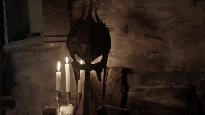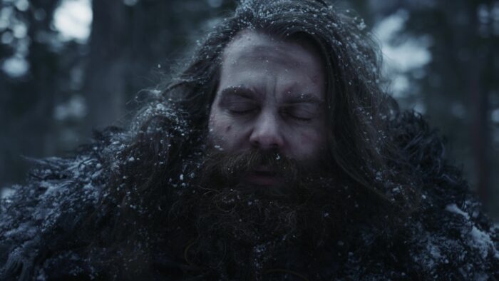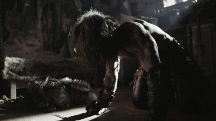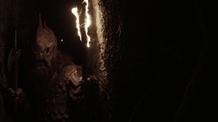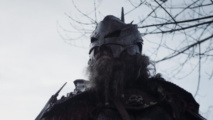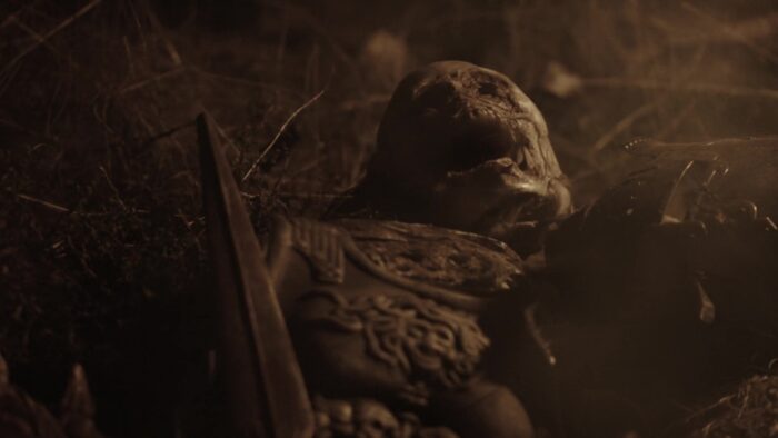 Donc ici, la majeure partie du temps, une seule personne à l’écran, un guerrier seulement connu sous le nom du père (Father), vivant seul, dans sa cabane, avec son cheval, et dont la seule activité, enfin, les deux seules activités sont de traquer des monstres pour en collectionner les têtes qu’il accroche au mur de sa cabane, et entre deux décapitations, réparer son armure. Son but ultime bien entendu est de retrouver le monstre qui a prit la vie de sa fille, enterrée non loin de là. Un propos simple, voir minimaliste. Qui au départ peut poser souci, tant le film utilise des artifices aussi simples que répétitifs. Oui, notre guerrier va tuer des monstres, mais non, on ne verra jamais un seul affrontement. Un personnage qui sort du cadre pour aller se battre et n’y reviendra qu’une fois une tête coupée dans sa main, ce genre de choses. Mais le film ne cherche jamais à varier la formule durant sa première moitié, ce qui rend le procédé un peu dommage, surtout que malgré le côté simpliste et donc le minuscule budget, il y a d’excellentes choses à l’écran. Oui, le budget est extrêmement bas, et pourtant, au-delà du camouflage du ce manque de budget par l’absence de combats, on ne le ressent pas. Le seul acteur à l’écran est convaincant, les décors, naturels, sont sublimes, les costumes sont réussis, les différents effets pour les têtes des créatures aussi et montrent des designs vraiment sympathiques, et la photographie, de jour comme de nuit, met le tout en valeur. En réalité, une fois le concept minimaliste accepté, le rythme lent digéré, le fait que les combats ne sont absolument pas le cœur du récit, il se dégage quelque chose de The Head Hunter, qui ne parlera probablement pas à tout le monde, mais qui est pourtant là.