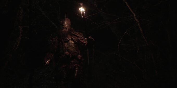 Donc ici, la majeure partie du temps, une seule personne à l’écran, un guerrier seulement connu sous le nom du père (Father), vivant seul, dans sa cabane, avec son cheval, et dont la seule activité, enfin, les deux seules activités sont de traquer des monstres pour en collectionner les têtes qu’il accroche au mur de sa cabane, et entre deux décapitations, réparer son armure. Son but ultime bien entendu est de retrouver le monstre qui a prit la vie de sa fille, enterrée non loin de là. Un propos simple, voir minimaliste. Qui au départ peut poser souci, tant le film utilise des artifices aussi simples que répétitifs. Oui, notre guerrier va tuer des monstres, mais non, on ne verra jamais un seul affrontement. Un personnage qui sort du cadre pour aller se battre et n’y reviendra qu’une fois une tête coupée dans sa main, ce genre de choses. Mais le film ne cherche jamais à varier la formule durant sa première moitié, ce qui rend le procédé un peu dommage, surtout que malgré le côté simpliste et donc le minuscule budget, il y a d’excellentes choses à l’écran. Oui, le budget est extrêmement bas, et pourtant, au-delà du camouflage du ce manque de budget par l’absence de combats, on ne le ressent pas. Le seul acteur à l’écran est convaincant, les décors, naturels, sont sublimes, les costumes sont réussis, les différents effets pour les têtes des créatures aussi et montrent des designs vraiment sympathiques, et la photographie, de jour comme de nuit, met le tout en valeur. En réalité, une fois le concept minimaliste accepté, le rythme lent digéré, le fait que les combats ne sont absolument pas le cœur du récit, il se dégage quelque chose de The Head Hunter, qui ne parlera probablement pas à tout le monde, mais qui est pourtant là.