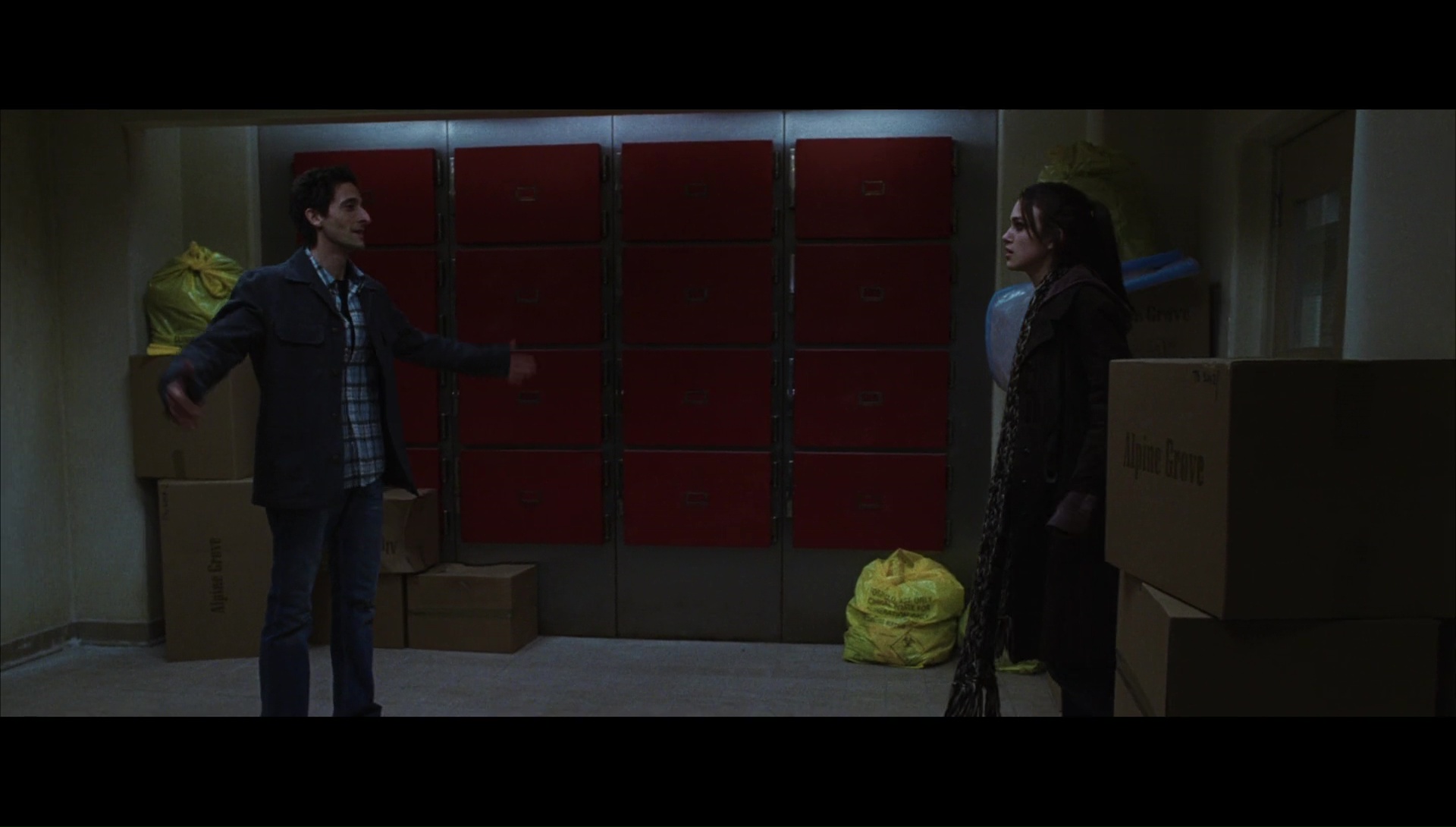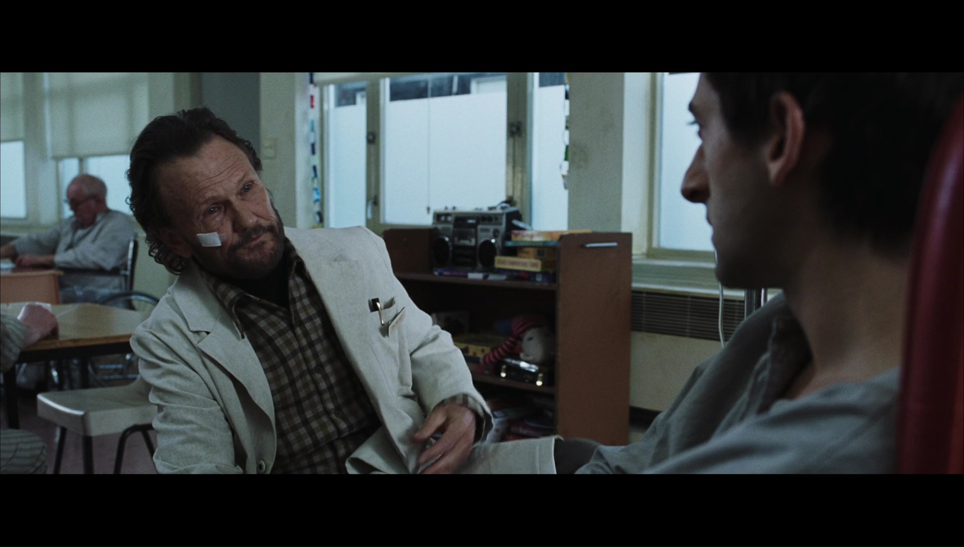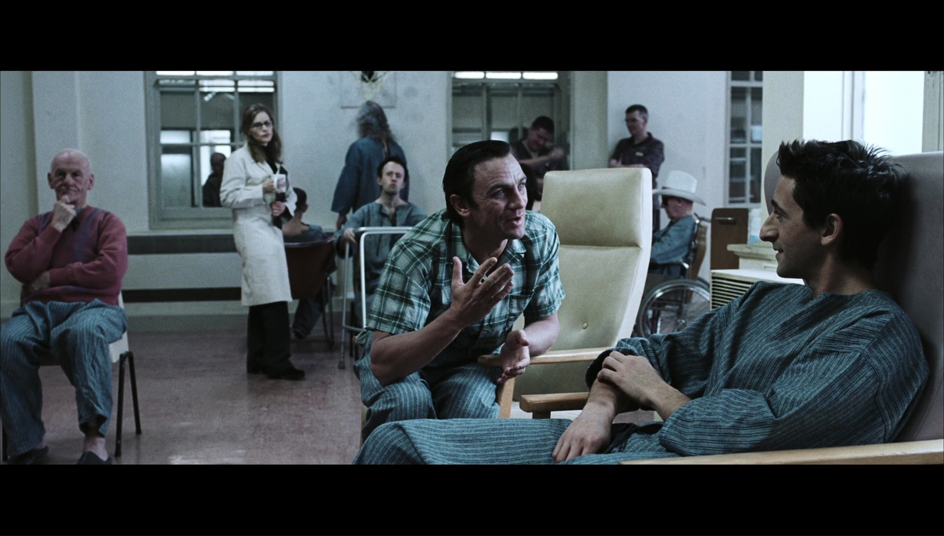 Un hôpital tout ce qu’il y a de plus normal dans le genre, avec un docteur faisant des expériences sur ses patients (Kris Kristofferson donc), des infirmières attentives, et des patients un peu tarés, dont un Daniel Craig méconnaissable et brun. Et chaque nuit, Jack est emmené au sous-sol pour des expériences. En camisole, il est enfermé dans un placard. Non, pas un placard à ballet pour punir les enfants, mais dans le tiroir d’une morgue plutôt. Dans un premier temps, The Jacket joue très bien sur son aspect glauque et claustrophobique d’ailleurs. Il faut dire que Adrien Brody fait du très bon boulot, et que la mise en scène lui colle à la peau lorsqu’il est enfermé dans ce fameux tiroir. De plus, le film débute fort, sans temps mort, avec quelques images de guerre, et quelques images violentes qui mettent clairement dans le bain. À quelques effets de styles un peu inutiles et répétitifs près, c’est de l’excellent boulot donc, presque étouffant par moment. Ce qui est étonnant de la part de John Maybury, réalisateur anglais beaucoup plus habitué aux simples drames et aux biopics (The Edge of Love en 2008, Love is the Devil en 1998). Mais plutôt rapidement, le film insère dans son récit l’aspect fantastique, plutôt inspiré de l’Effet Papillon et datant d’un an plus tôt. Jack, enfermé dans son tiroir, se retrouve propulsé dans un avenir. Un avenir où il est déjà mort, mais où il retrouvera quelques personnages de son passé, afin de mener l’enquête sur son propre meurtre, car il apprend qu’il ne lui reste, dans le présent, là où il est attaché dans le tiroir, que 4 jours à vivre. Une base simple, mais plutôt efficace, et surtout que le métrage ne va pas utiliser n’importe comment. La réalisation qu’il est dans l’avenir par exemple ne sera pas un élément sur lequel le film va insister lourdement avec ses gros sabots.