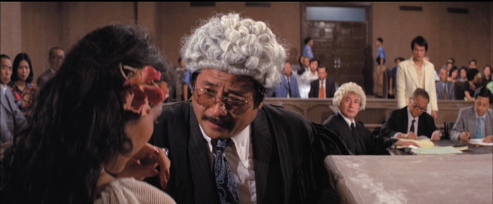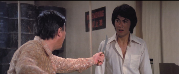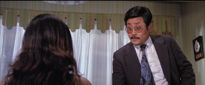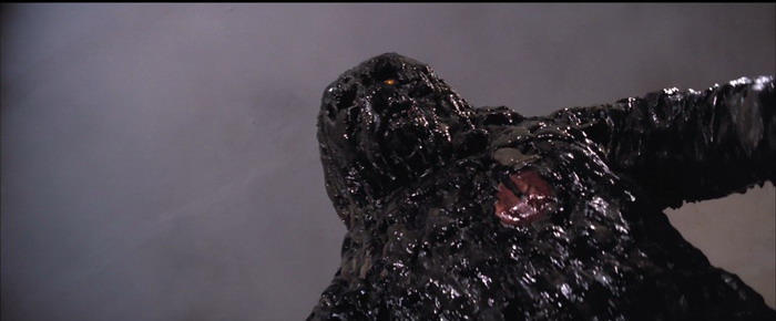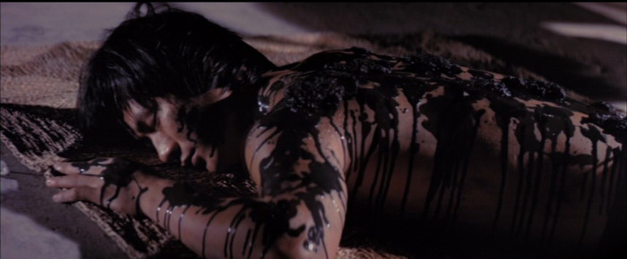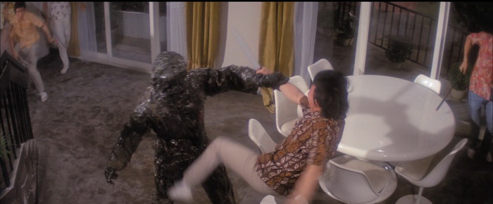 Rien que le visuel du monstre d’huile est improbable et vaut le visionnage du film. Chaque scène où il apparait fait tomber le film dans le nanar pur jus. Avec son look qui ressemble à une énorme bouse de vache humanoïde, ses grognements d’un kitch absolu, difficile de ne pas au moins esquisser un sourire, si ce n’est plus, en le voyant. Alors quand on constate qu’il se déplace sous forme de tache d’huile, avec des effets spéciaux HK de 1976, donc qui sont ce qu’ils sont, avec un plagiat de la musique des Dents de la Mer quand il ne va pas tarder à apparaitre, difficile pour l’amateur de cinéma bis de ne pas prendre son pied devant un tel spectacle. Il n’y a pas que le monstre en lui-même qui est improbable, il y a aussi ses sauts, ou plutôt ses chutes qu’on a mis à l’envers pour donner l’impression qu’il saute très haut, quand ce n’est tout simplement pas un mannequin en caoutchouc qui est tracté vers le haut par un câble. Tout est d’un kitch assez réjouissant pour quiconque aime un tant soit peu le cinéma bis. Mais je ne vous dis pas tout puisqu’il est capable de faire repousser ses membres ou de balancer des jets d’huile par sa bouche. Le film n’hésite en plus pas, dès qu’il en a l’occasion, à nous montrer des paires de boobs dès qu’il en a l’occasion, souvent complètement gratuitement. Alors, oui, c’est certains, la mise en scène du film n’est pas ce que Ho Meng-Hua a fait de mieux. Oui, le scénario est quelque peu abandonné en cours de route et le film ressemble bien plus à une succession de scènes un peu répétitives dans lesquelles notre maniaque huileux va tuer des gens qui méritent de mourir. Mais au final, qu’importe, parce que le résultat tragico-satirico-grotesque est très distrayant, le sous-texte n’est pas inintéressant, et puis le monstre, quel monstre !