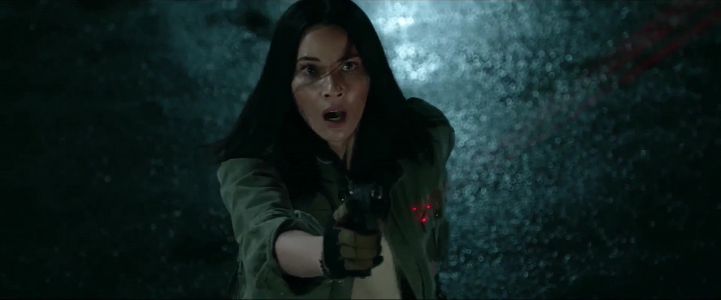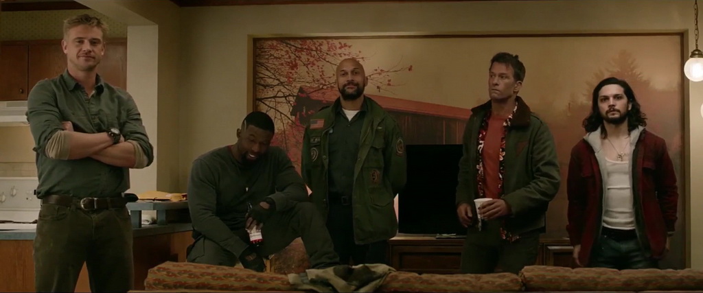 On a un peu de gore, une équipe de militaires burnés (en route normalement pour la prison), une scientifique jouée par Olivia Munn qui devient soudainement une experte en arme à feu en deux scènes, quelques scènes surprenantes, et des scènes à l’humour totalement WTF qui peuvent déclencher des fous rires, ce qui n’est, on est d’accord, pas forcément le but d’un film Predator à la base. Car voir le Predator se servir d’un bras coupé avec un pouce en l’air pour signaler à un chauffeur de camion que tout va bien à l’arrière, c’est fait avec humour, mais ça reste incroyablement con. L’humour est bien entendu également là dans les personnages, avec notamment le personnage joué par Thomas Jane qui est atteint du syndrome de la tourette. Tout un programme, donnant des scènes bien stupides, et malheureusement aussi qui s’étirent parfois en longueur. Quand à la violence donc, celle promise par le réalisateur, elle est présente, ça gicle, ça coupe, mais avec le ton comique et décontracté de l’ensemble, elle n’a pas le même effet qu’autrefois, c’est une violence plus de comic book. Mais la première heure fonctionne oui. Jusqu’à l’arrivée du chasseur de prime Predator. Un Predator beaucoup plus grand, plus brutal, accompagné de deux chiens (pour la chasse donc, traquer les proies).