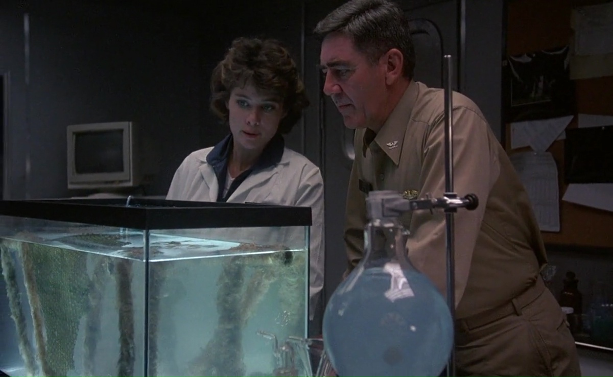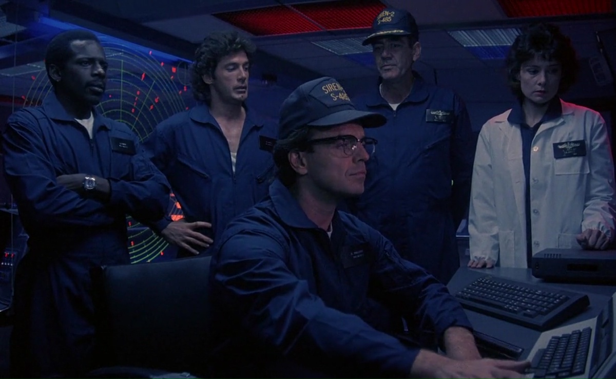 Du classique tout ça, mais parfois, il n’en faut pas plus pour faire une petite série B sympathique. Ce qu’est The Rift au final, malgré de bien gros défauts inhérents au genre. De gros défauts, mais des qualités en faisant un film tout à fait sympathique pour peu que l’on aime le genre. Car disons le d’emblée, le choix de Jack Scalia dans le rôle principal, direct, ça ne va pas. Oui, il a une fort jolie chevelure sentant bon la fin des années 80, mais il ne sait pas jouer. Et comme c’est le héros, ben forcément ça fait tâche. Heureusement qu’on peut trouver à ses côtés des gueules connues et surtout de meilleurs acteurs, avec R. Lee Ermey (Full Metal Jacket), décidemment habitué à jouer les sergents, ou encore Ray Wise (Twin Peaks), même s’il va passer la première moitié du film à taper sur quelques malheureux boutons. Autre défaut clairement de son époque, il faut forcément que l’équipage du sous-marin ai à son bord le noir rigolo de service, qui n’est jamais drôle et pense avec sa queue. Clichés, check ! Dans sa structure, le métrage sent bon cette époque là également, avec une première partie un peu lente pour nous exposer ces personnages et faire durer le suspense, avant de se faire bien plus généreux par la suite. On a donc 40 petites minutes avec notre sous-marin explorant les fin fonds marins, ayant quelques soucis (rencontrant une pieuvre aussi), arrivant à destination, avant que l’aventure ne démarre réellement. Une première partie certes un peu lente mais plutôt sympathique au final, avec une petite ambiance minimaliste assez sympathique. On sent le budget limité dans les décors (on verra souvent les mêmes pièces du sous-marin, les décors extérieurs sont limités), mais l’ensemble passe plutôt bien.