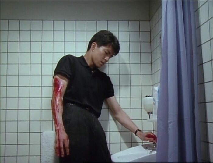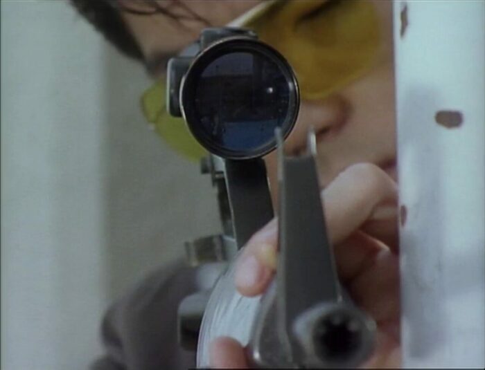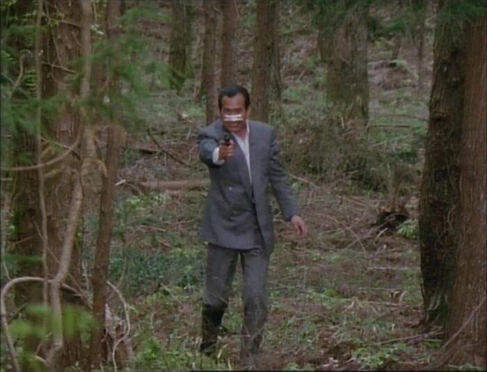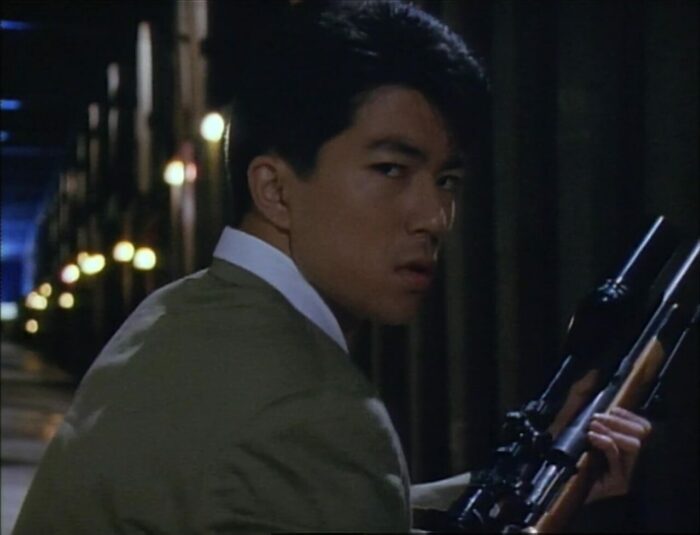 Sorti en 1989 par Toei, The Shootist est le premier film d’une saga de V-Cinema, débutée donc alors que le genre connaissait ses premiers pas, parvenant à la fois à attirer de nouveaux venus qui voient une chance de débuter avec une grande liberté malgré des budgets et délais serrés, et des vétérans, sans doute contents de retrouver une liberté dans le fond ? Qu’importe. En 1989, le V-Cinema débute vraiment, et si on ne pourrait pas parler non plus d’heures de gloire, autant dire que les films distribués directement en vidéo club sont variés, entre polar, horreur, érotisme, et que malgré les conditions de tournage, la qualité est, elle, présente. The Shootist, c’est l’un des premiers métrages de Ichikura Haruo, qui par la suite signera les trois opus suivants de la saga, et reprendra la saga Be-Bop High School (enfin, la seconde saga) pour les quatre derniers opus (3, 4, 5 et 6). Le tout est scénarisé par Oka Yoshirô, qui se spécialisera dans les polars à bas budget (et donc, forcément, dans les années 90, souvent avec Aikawa Shô et Takeuchi Riki), tandis que la musique est signée Ohno Yuji, loin d’être inconnu ou débutant, ayant déjà officié sur bon nombre d’animés, mais aussi sur quelques films comme Never Give Up en 1978. Et devant la caméra, nous n’avons pas un inconnu, mais le charismatique Nakamura Toru pour jouer le sniper, que l’on a découvert pour beaucoup dans les Be-Bop High School au milieu des années 80 (la première saga donc), mais aussi The Gentlemen’s Alliance ou le génial Shinjuku Love Story en 1987. Encore actif aujourd’hui, on a pu le voir dans Shin Kamen Rider par exemple. Et The Shootist donc, découvert plus de 30 ans après sa sortie, et bien ça reste une belle découverte, mais aussi une découverte étrange.