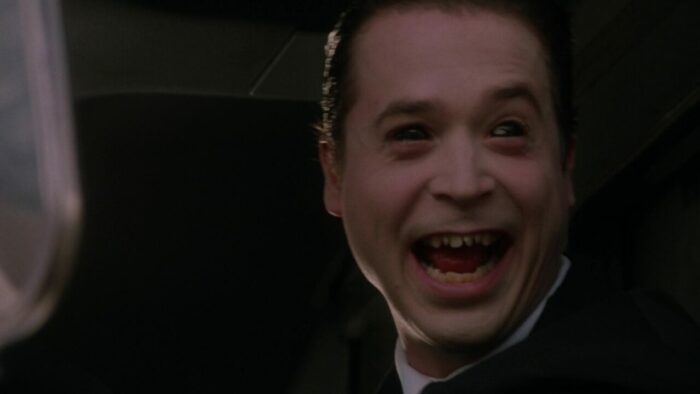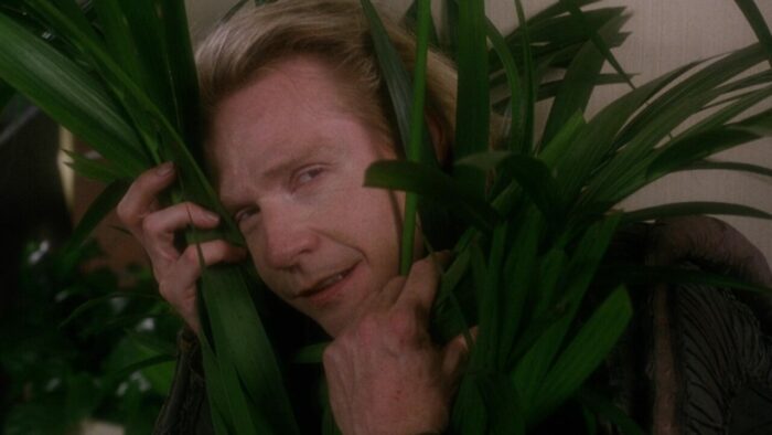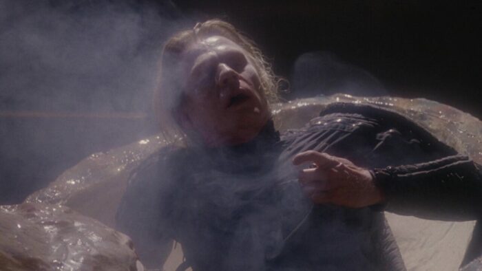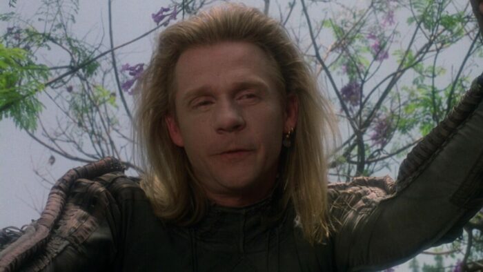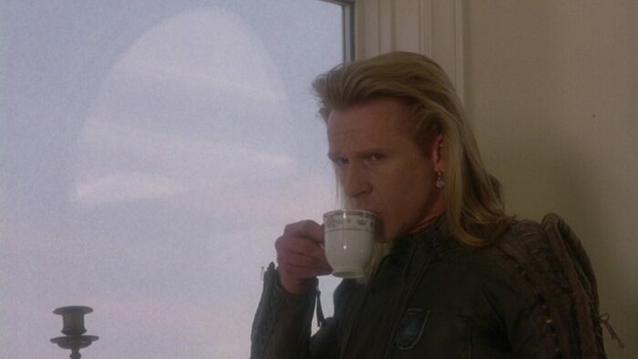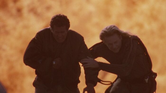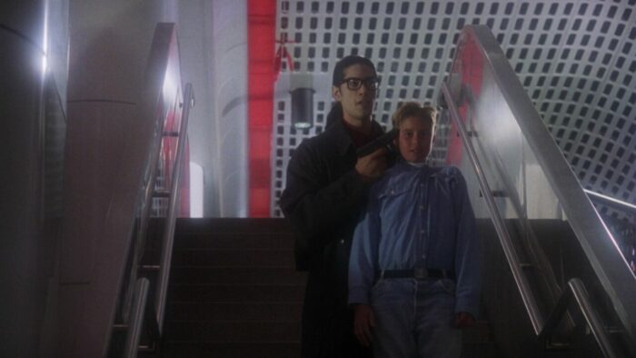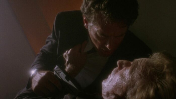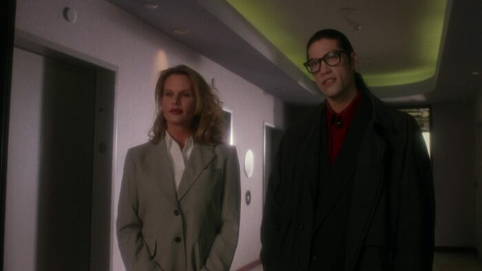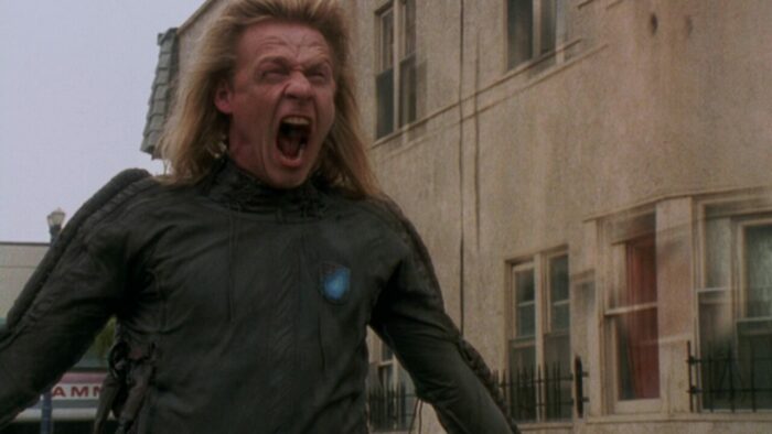 Chez PM Entertainment, on aime la SF. Cyber Tracker et sa suite, T-Force ou Dark Breed sont autant d’exemples de reprises opportunistes (tour à tour sont pompés Terminator et sa suite, Blade Runner et Alien entres autres scènes et idées reprises ici et là) dopées à l’action et aux explosions. Bien qu’il soit question d’hommes en noir dans The Silencers, ce n’est pas du coté de Men In Black qu’il faut chercher, cette production PM étant trop en avance pour se reposer sur le film de Barry Levinson. Ici, Richard Pepin Et Joseph Mehri emprunte un peu partout, en premier lieu au succès de X-Files à la télévision. Les extraterrestres existent, ils sont liés au gouvernement mais surtout ils préparent une invasion de la Terre. Pour ce faire ils ont une méthode intéressante qui marche de planètes en planètes : crasher un vaisseau sur le système à envahir, bosser avec le gouvernement pour échanger sur les technologies, et jouer les victimes en accusant le gouvernement de les exploiter. Ils passent pour pour des pantins mais en réalité, ils la font à l’envers aux terriens. Ils veulent ouvrir une porte des étoiles comme dans Stargate pour faire venir un commando de cinq aliens pour commencer l’invasion. Dans The Silencers, les aliens sont représentés sous la forme d’hommes en noir mais les men in black de chez PM, ils n’ont pas de Neuralyzer pour effacer la mémoire des gens. Eux, pour faire taire leur existence, ils prennent un regard méchant avec des yeux tout moches et menace de tuer toute ta famille si tu parles, sur un ton ferme et définitif. En l’état c’est un peu plus compliqué que ça, ils manipulent les esprits et remplacent les personnes influentes par des clones au sang vert. Heureusement Jack Scalia, après avoir affronté des androïdes dans T-Force et d’autres aliens plus moches dans Dark Breed, est là pour sauver la terre et il n’est pas seul. Arrivé d’une dimension parallèle en passant par la porte des étoiles dans une cosse de l’espace, un autre alien va lui prêter main forte.