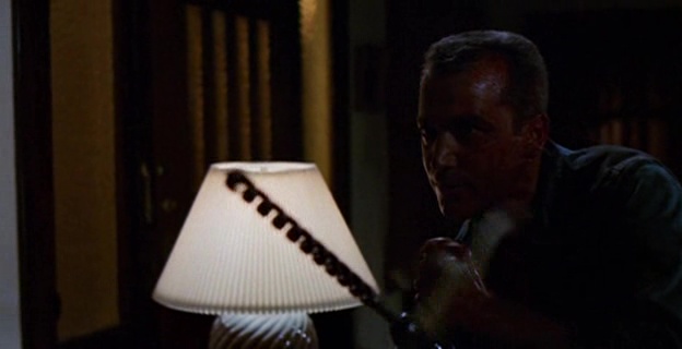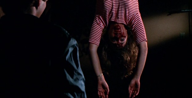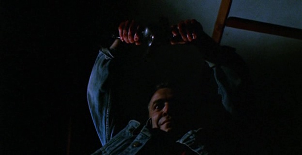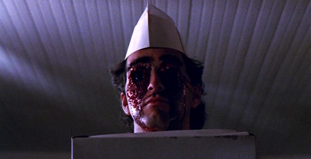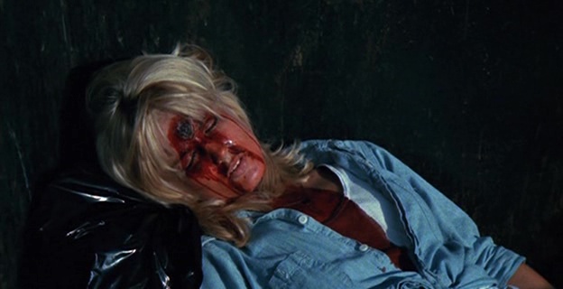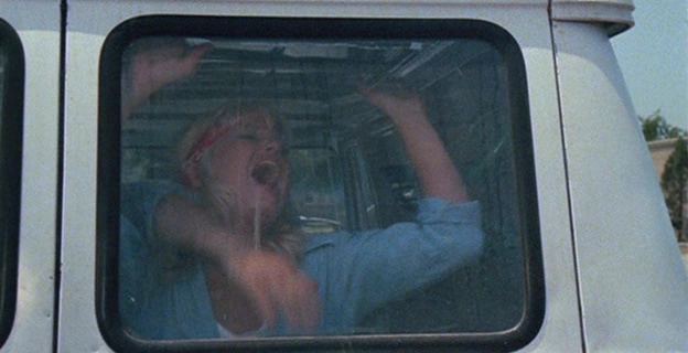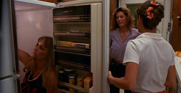 Le cahier de charge est donc bien là de ce côté là. Dommage que Amy Holden Jones ne fasse pas toujours les meilleurs choix à la mise en scène. Non pas que ce soit mauvais, on a souvent vu bien pire, la réalisatrice livrant d’ailleurs parfois quelques très jolis plans, de beaux travellings, et quelques idées fonctionnant avec la profondeur de champ sont intéressantes, comme lorsque d’un dialogue, le tueur rentrera discrètement derrière les personnages en passant par la fenêtre. Mais à côté de ça, notamment dans la première demi-heure, elle filme de manière plutôt plate des dialogues déjà pas forcément intéressants à la base, ce qui pourra provoquer chez certains spectateurs l’ennui. Niveau meurtre, même si cela reste assez soft, le montage fait par contre du plutôt beau boulot pour camoufler le manque d’argent. Mais la grande qualité du métrage, c’est bien son humour totalement décomplexé. Le public veut des héroïnes écervelées, et bien ici pour évacuer le stress, elles mangent une pizza, livrée par un homme ayant succombé au tueur, les yeux arrachés, alors que la boite est posée sur le cadavre. Et on ne nous ment pas sur le message de ces métrages, où le tueur traquant une femme avec une arme (souvent le couteau) pour la pénétrer (enfin, la tuer mais vous voyez) est souvent vu comme une pulsion sexuelle, puisqu’ici, le tueur tiendra dans certains plans sa foreuse dans une position très suggestive. Le bouchon est poussé encore plus loin lorsqu’il s’apprête à tuer avec sa gigantesque machine une des filles, qui d’un coup de machette… casse le bout de son engin ! Il faut voir la tête du tueur à ce moment là pour comprendre que sa virilité en a prit un coup ! Et rien que pour ça, il faut voir Slumber Party Massacre !