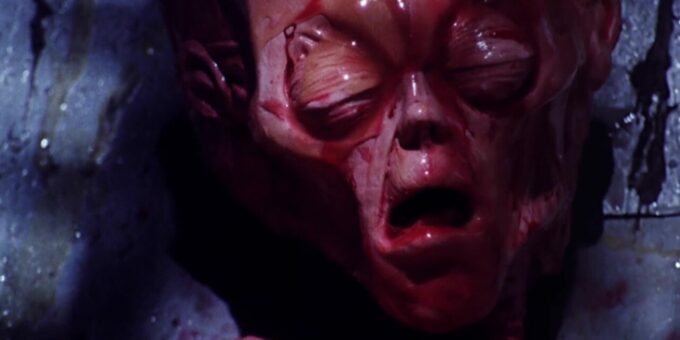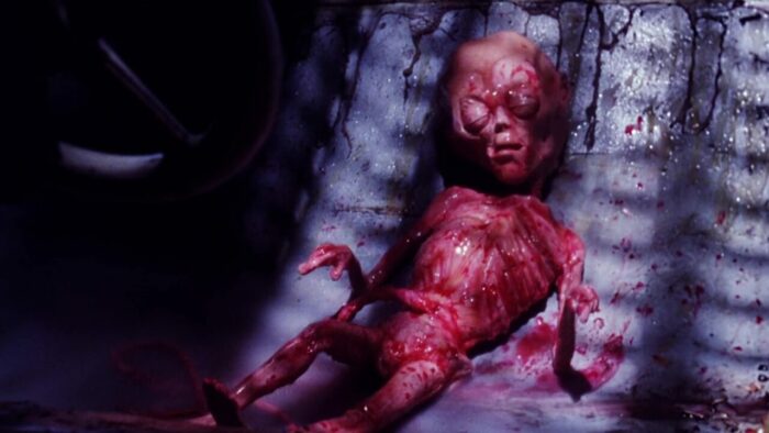 Enfin je pense qu’ils sont juste un peu cons, car que ce soit en tapant dans la porte, en envoyant des objets lourds contre, ou en y allant avec un marteau, la pauvre porte en bois ne bougera pas. Et les fenêtres vous me direz ? Et bien, comment l’expliquer avec des mots ? La gentille créature a décidé de boucher les issues avec… avec… quelque chose de gluant, voilà. Pourquoi la créature veut bouffer absolument tout le monde ? Car elle est méchante ? Sans doute. Car le réalisateur veut nous faire comprendre que l’avortement c’est mal ? Allez savoir. Est-ce que c’est fun ? Alors par instant, oui. Mais dans les grandes lignes malheureusement, le film ne tient pas toutes ses promesses. On peut avoir de la tendresse pour lui, face à sa maladresse constante, on peut rire avec lui dès que le monstre est là, mais malheureusement, il y a tout le reste à côté. Ça parle beaucoup par exemple dans The Suckling, et comme la mise en scène est souvent inexistante, que les décors sont moches et vides et que la photographie est… on dira que le plateau était éclairé, ce qui est déjà pas mal en soit. Et puis la créature, elle a beau être cool, enfin, rigolote comme tout, elle se fait souvent attendre, et par exemple, pendant la première heure, ces attaques sont rares (malgré sa première scène, sa mutation, plutôt bien fichue), et parfois, le peu de personnages présents passent leurs temps à… se foutre sur la gueule, et parfois, s’entre-tuer. Paf une balle perdue ici, une autre là. Une vraie déception si vous attendiez un festival de n’importe quoi. Heureusement oui, quand c’est le monstre qui s’y met, là c’est un autre niveau, puisque la créature, en plus de courir maladroitement, elle décapite, coupe des mains, et se montrera presque douée d’intelligence en électrocutant un personnage.