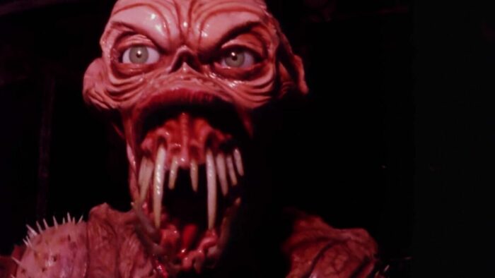 Enfin vu le niveau global de l’intelligence des personnages, n’ayons pas peur des mots, cette créature est un pur génie. C’est d’ailleurs passé cette scène que le film se réveille, et montre alors tout son potentiel nanar, alors qu’il ne reste qu’environ 25 minutes au compteur. Là, oui, le bodycount s’accélère, le film a des idées pour lesquelles il n’a absolument pas le budget (ni le talent), comme l’antre de la créature, une sorte de nid qui ne ressemble pas à grand-chose, si ce n’est que l’on a l’impression que l’équipe a balancé sur des murs des filets, quelques morceaux de viande, puis éclairé le tout en rouge pour faire genre. Mais comme dit, on peut avoir de la tendresse pour tout ça. Car The Suckling n’a coûté que 50 000 dollars, dont 10 000 qui seraient déjà partis dans la création du monstre. Car c’est le seul film écrit et réalisé par Francis Teri aussi. Et car, si l’on en croit les propos du monsieur, le tournage ne fut pas une expérience plaisante, si bien qu’il décida d’arrêter sa carrière. C’est bancal, ça manque d’idée de mise en scène, ça manque de rythme, et ça se prend bien trop au sérieux cependant. Mais, il y a un mais. The Suckling nous laisse sur une note très positive. Enfin, positive…. Sur un pur moment hallucinant comme vous n’en avez jamais vu, et s’étendant sur deux scènes finales. Et je ne spoilerais point au cas où quelques malheureux voudraient tenter l’expérience. Mais ce final, ça sonne à mes yeux comme si l’équipe était arrivée au bout du tournage, qu’il fallait conclure, et que sans idée particulière, ils se sont enfilés LSD, lignes de coke, et un petit rhum pour adoucir le tout, et que paf, l’idée du siècle était arrivée, l’idée putassière pour que le spectateur se souvienne à tout jamais du métrage. Et ça, c’est vrai qu’on ne peut pas leur reprocher, on s’en souviendra longtemps de ce final. Maintenant, moi, je veux un remake, tout aussi fauché, mais qui se sert un peu plus de son monstre rigolo ! Ah, oui, et étonnement, la musique est bonne.