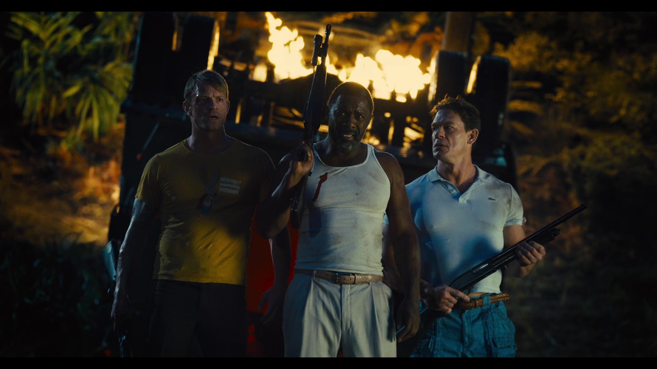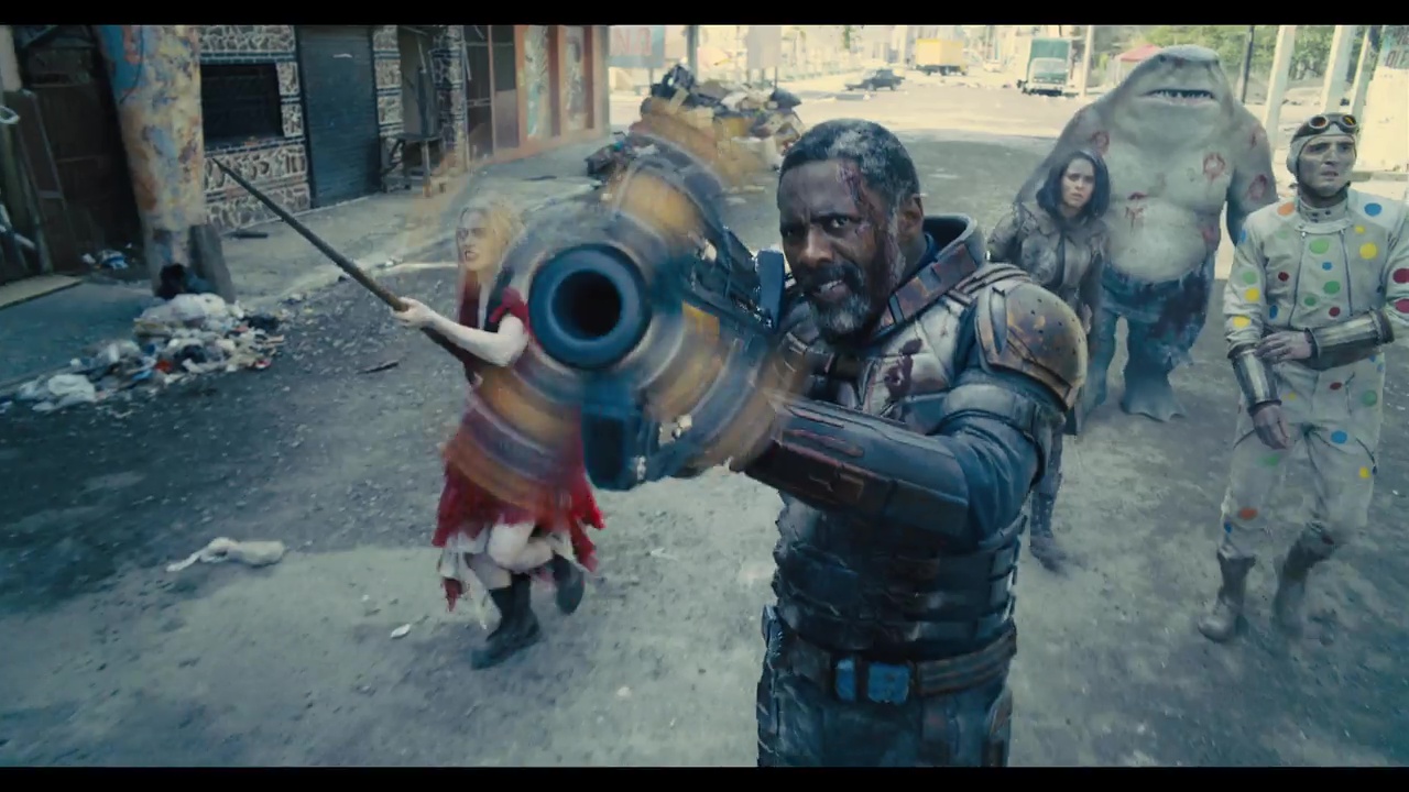Car oui, si ce n’est pas parfait, que c’est parfois prévisible, parfois bancal, et bien, à d’autres moments, ça délivre la marchandise. James Gunn n’a aucunement changé, son humour est toujours là, et une fois sur deux, ça fait mouche et on rigole bien, tandis qu’à d’autres, c’est un peu trop lourd et vulgaire. Parfois, c’est violent pour être violent (donc, ça reste plutôt fun), et à d’autres, la violence vient sublimer une petite idée, comme lorsque Harley Quinn armée de mitrailleuses puis d’un javelot se farcie à une armée à elle seule, où James Gunn démontre qu’il sait filmer, et rendre l’action lisible quoi qu’il arrive, excellent point. Et puis, malgré les facilités, Gunn s’en sort plutôt bien avec son trio de personnages principaux, et a su recruter les bon acteurs. Alors oui, Margot Robbie reprend encore son rôle de Quinn, mais Idris Elba et John Cena a ses côtés n’ont pas à rougir. Cena se montre d’ailleurs beaucoup plus drôle et dynamique que dans son autre blockbuster de 2021, à savoir Fast and Furious 9. Heureusement, vu la qualité générale du film d’ailleurs. Voilà, c’est simple, si le film est loin d’être parfait, il reste fort sympathique, et un bon divertissement estival. Et en ce qui concerne les films DC, il en est le meilleur film depuis Joker, et avant la trilogie de Christopher Nolan, surtout lorsque l’on est allergique au style de Zack Snyder (crédité comme producteur exécutif ici). Il n’en atteint jamais le niveau puisqu’il n’en a aucunement la prétention artistique, mais il se pose là. Surtout qu’après une année 2020 du coup assez morne voir vide cinématographiquement parlant, voir un film fun et défoulant fait toujours du bien. Surtout quand face à lui, les concurrents sont Fast 9 donc, on en a déjà parlé, ou Black Widow (pas fou fou non plus). En tout cas, James Gunn a réussi son pari dans le fond, même s’il est aidé par le ratage de la première version, et par sa sortie après un long temps assez morne en salles.