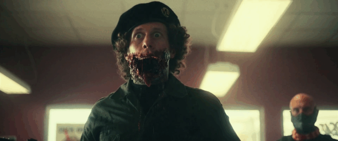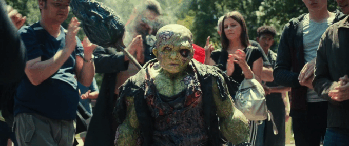 Ce n’est pas tant le fait que Toxic Avenger est un remake qui en fait un mauvais film. Même en faisant abstraction de ses origines, le métrage qui se veut corrosif est au final lissé plus que de raison et n’ose jamais aller au bout de ses idées… ni même aller à fond dans le gore. Et c’est ici la pire chose qui ressort du film : le sentiment d’avoir été pris pour un con. Le unrated flanqué au titre non seulement dans le trailer mais aussi dans le métrage n’est qu’un pur argument marketing. Non, The Toxic Avenger n’est pas le film insortable car trop gore qui a été vendu. Il y a bien une poignée de scènes gores, mais elles sont au final plus sages que le film original, il n’y a qu’à voir la scène du restaurant qui ne tient aucunement la comparaison. De manière globale, avec un gore aujourd’hui banalisé à l’écran, il ne tient pas non plus la comparaison avec les standards actuels et ce qui tient surtout de l’incompréhensible, c’est le nombre de morts hors champ, ce qui la fout mal quand on parle de Unrated. Il y a bien un intestin grêle extirpé d’un cul et une scène de pisse acide (qui n’a rien de gore), mais encore une fois le coté trash voulu n’existe tout simplement pas. Quant au reste de « l’esprit Troma », c’est sur le papier et uniquement sur le papier qu’il est présent. L’humour ? Avec un peu de chance vous sourirez deux fois. Les boobs ? Deux plans furtifs vite fait bien fait. L’univers fou et décalé ? Un monde coincé entre plusieurs époques qui avait l’air plus dingue dans le premier teaser. The Toxic Avenger n’est donc au final qu’un film de studio de plus qui ne doit son coté pseudo subversif qu’à ses origines, sans quoi il n’aurait rien eu à proposer, déjà que c’est vraiment chiche. The Toxic Avenger version 2023 est donc un ratage dont on sauvera le casting et le peu de scènes gores présentes, avec de la tolérance puisque les CGI sont de la partie. Le reste tient du remake raté qui ne fait pas honneur à son modèle. Mais même en faisant abstraction de ça, le métrage reste raté et mal fichu. C’était à prévoir, c’est pire que prévu. Paie ta déception !