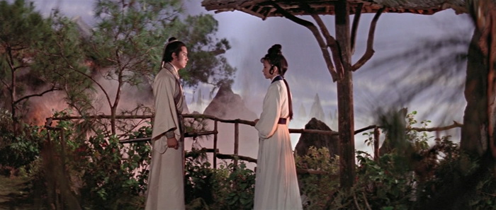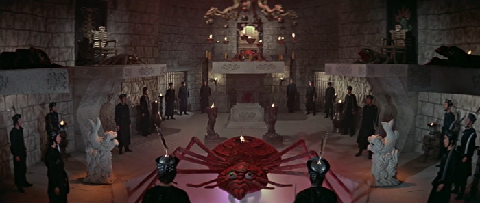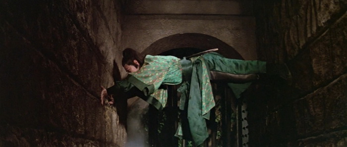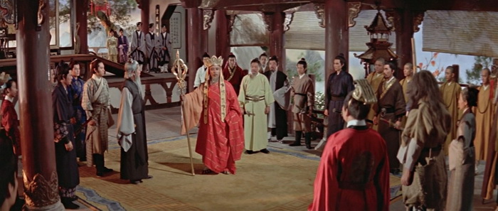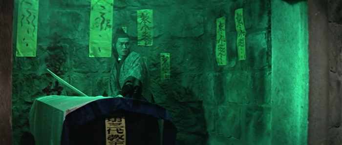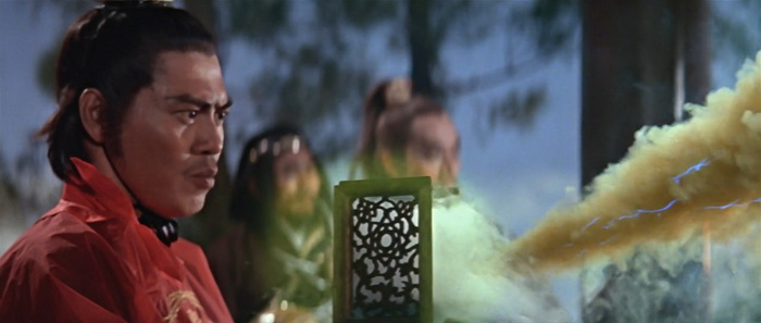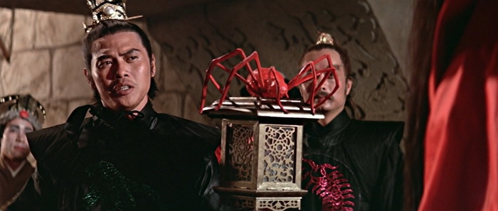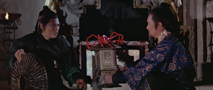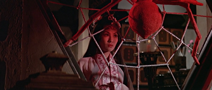 Au milieu des années 70, la Shaw Brothers va pas mal expérimenter dans le wu xia pian, tordant les codes traditionnels du genre pour essayer d’y amener de la nouveauté, et avec The Web of Death, Chu Yuan en fait de même mais toujours avec sa vision plus intellectuelle et stylisée du genre. Même si le réalisateur a la réputation de proposer des films souvent plus exigeants que bon nombre de bobines de ses confrères de son époque, The Web of Death se fait résolument bien plus pulp que de nombreux films de sa filmographie, se rapprochant même parfois, avec plusieurs années d’avance, sur les délires psychédéliques du début des années 80 du studio. Adaptant librement une fois de plus l’univers romanesque de Gu Long, nous sommes ici en présence d’un wu xia pian aussi ridicule que génial, délaissant les nombreux rebondissements et trahisons qui caractérisent souvent la filmographie du réalisateur, pour se concentrer sur le divertissement proche sur certains aspects du film d’aventure. Le résultat n’en est au final que des plus rafraichissants. Rien que l’idée d’une araignée magique dont les toiles capturent les ennemis et les fait fondre nous fait rapidement comprendre qu’on est sur quelque chose de plus léger, de plus fantaisiste, mais cela ne rend pas The Web of Death moins intéressant. Déjà, visuellement, le film est des plus audacieux. Certes, nous sommes souvent ici dans un kitch de tous les instants, avec ce charme désuet des décors de la Shaw Brothers, mais le film nous présente souvent des décors assez audacieux comme par exemple les différentes salles de la grande bâtisse du clan Venom qui font preuve d’une belle créativité. Ces décors sont d’ailleurs souvent assez dépouillés, mais rien n’y est laissé au hasard comme si chaque scène avait été pensée comme un tableau. Les éclairages semblent d’ailleurs parfois irréels, avec des filtres souvent colorés, comme si le directeur photo avait voulu créer une ambiance oppressante malgré le côté pulp de ces scènes.