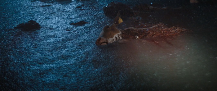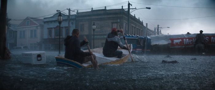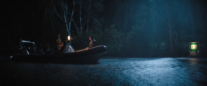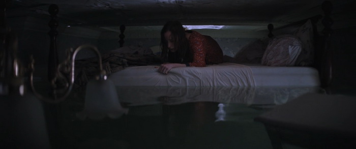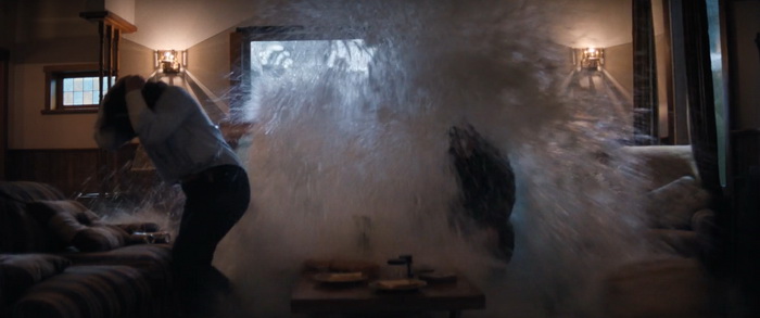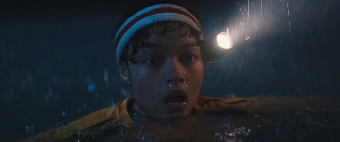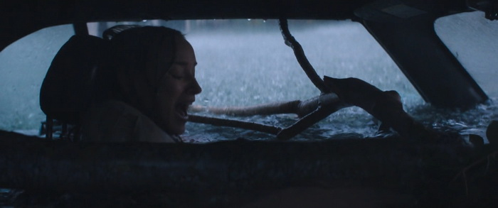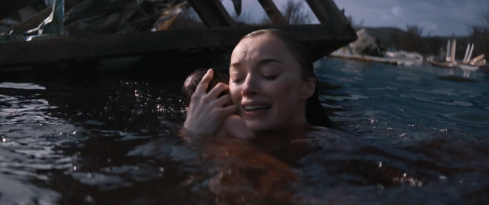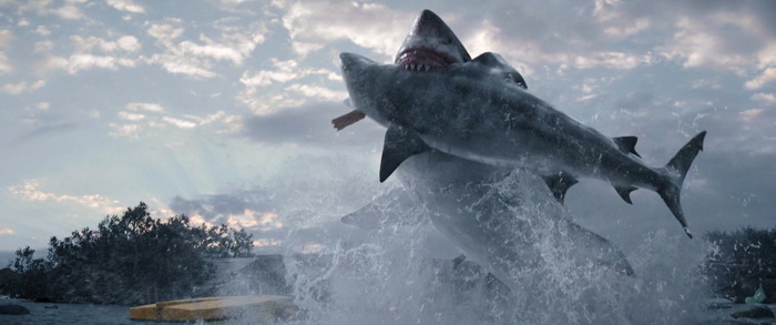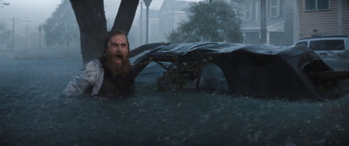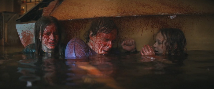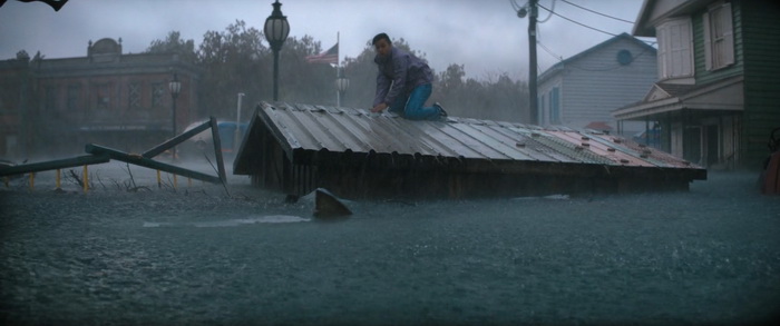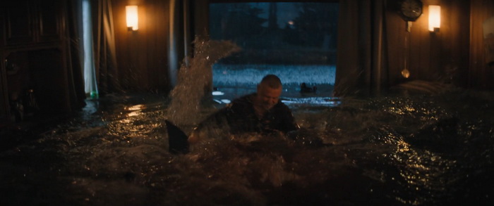 Du coup, pour quiconque a un peu l’habitude de ce genre de films, la tension n’est jamais réellement à son comble et il n’y a pas de moments réellement marquants, bien que certains passages soient malgré tout très funs. Wirkola aime le gore, et même si c’est gentillet ici, il en distille malgré tout un petit peu histoire de rappeler qu’on est bel et bien dans une série B assumée et que, bon, des requins, eh bien ça arrache des mains en deux coups de dents. Par contre, là où Thrash s’en sort réellement bien, c’est dans sa mise en scène. Nous savons pertinemment que nous ne sommes clairement pas ici dans un film au budget de blockbuster, mais pourtant la qualité de production est réellement solide. La photographie est soignée et la mise en scène visuelle des éléments de la tempête est traitée avec une vraie compétence. Il y a même des scènes réellement impressionnantes et tout a été fait pour rendre l’environnement dans lequel évoluent les personnages crédible. Si ça fonctionne aussi bien, c’est que Wirkola a réussi à trouver un bon équilibre entre CGI et effets pratiques, aussi bien dans ces décors inondés que les vilaines bébêtes qu’il y a dans l’eau, les fameux requins. A quelques exceptions près, les CGI sont plutôt bons (à l’exception peut-être du bébé en images de synthèses), mais la bonne idée a été d’utiliser des animatroniques pour les interactions proches entre les bêtes et les humains. Du coup, le rendu à l’écran a bien plus d’impact, avec des attaques rapides, sauvages, et des acteurs qui se font parfois valdinguer dans tous les sens. Et puis avec ses 1h19 au compteur qui on enlève le générique de fin, le film ne chôme pas et on sent que Wirkola n’avait pas d’autres but que celui de divertir le spectateur en lui proposant un divertissement certes bas du front, qui prend sans doute bien plus d’ampleur quand on le regarde entre potes avec une bière dans la main et en éteignant le cerveau, mais qui donne ce qu’on est venu chercher, et qui est par exemple tout ce que Sous la Seine a essayé d’être sans jamais y arriver. Ce n’est pas un grand film, non, mais ça fonctionne bien et c’est tout ce qu’on lui demandait.