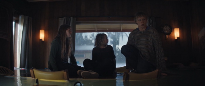 Thrash met rapidement en place son contexte en nous présentant un énorme ouragan de catégorie 5 qui s‘abat sur une ville côtière et la submerge. Le chaos s’ensuit forcément et un petit nombre d’habitants se retrouvent piégés chez eux et doivent survivre alors que les eaux montent. Et comme si ça ne suffisait pas, des requins bouledogues et même un grand requin blanc ont décidé de s’inviter à la fête. Ce scénario vous dit quelque chose ? C’est normal, c’est à quelque chose près celui du film Crawl (2019) d’Alexandre Aja, mais avec des requins-bouledogues à la place des crocodiles. C’est certain, question originalité, on repassera et Tommy Wirkola joue la carte de la sécurité en misant sur tous les clichés habituels de ce genre de production. La prévisibilité est donc de mise et à aucun moment on est surpris par le spectacle proposé, jusque dans ses tentatives de rebondissements. Mais pourtant, ça fonctionne plutôt bien parce que Wirkola semble maitriser son sujet. Trashs nous raconte deux histoires quasi distinctes. Il y a tout d’abord ces trois frères et sœurs adolescents, dont la relation tendue avec leurs parents d’accueil violents est interrompue lorsque trois requins se mettent à nager dans leur cuisine. Il y a ensuite cette jeune femme devenue agoraphobe depuis le décès de sa mère, qui va tenter d’aider comme elle peut une jeune femme enceinte coincée dans sa voiture devant chez elle. Malheureusement, ces deux histoires ne se croisent jamais et ce que le film gagne en rythme en passant d’un des arcs narratifs à l’autre, il le perd en intensité et en véritable investissement émotionnel du spectateur car il n’y a au final pas de personnage principal marquant qui ancrerait l’histoire ou qui donnerait au public quelqu’un pour lequel réellement vibrer. C’est dommage parce que les personnages, bien que surtout fonctionnels, sont plutôt sympathiques, prennent des décisions pas trop incohérentes, et auraient ne sont pas trop énervants (c’est souvent le cas avec les enfants dans ce genre de film).
