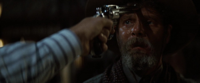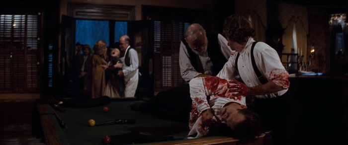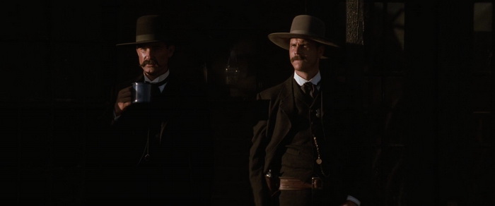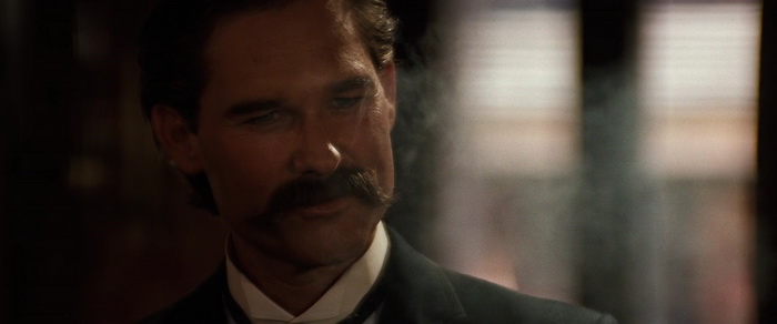 Mais finalement, du moins pendant 1h30, ce qui fait clairement le boulot dans Tombstone, c’est, outre la reconstitution historique (je vous ai déjà dit que j’aimais beaucoup les westerns ?), ce sera le casting. Tombstone laisse ses acteurs s’exprimer, et pour ça, ils peuvent se reposer sur un script plutôt solide qui donne un bon temps de développement, et donc un bon temps à l’écran à l’ensemble des personnages principaux. Kurt Russell a toujours la classe même avec sa moustache, mais c’est, étonnement, Val Kilmer dans le rôle du Doc Holliday atteint de la tuberculose qui s’en sort à merveille. Il est même épatant dans son rôle. Sam Elliott et Bill Paxton sont des excellents choix pour les frères Earp, et Paxton prouve encore une fois qu’il a du talent. De l’autre côté, celui des éternels bandits, on nous met également de très bons acteurs, avec Powers Boothe et Michael Biehn, même si on pourra regretter un temps de présence moindre à l’écran, et donc un développement un peu plus anecdotique, mais ce n’est pas leur film après tout. Au cœur du film, et contrairement au film de Costner, c’est bien la ville de Tombstone qui compte. Mais c’est totalement vrai, et c’est étonnant avec Cosmatos à la barre (enfin, plus ou moins comme on le sait aujourd’hui), que le film se fait beaucoup moins convaincant dans sa dernière demi-heure, quand après de bien tristes (et réussis) événements, les personnages laissent enfin parler la poudre en priorité. Comme si le film tombait alors dans les travers qu’il avait réussi à éviter jusque là, en oubliant les tourments et dilemmes des personnages pour en faire de simples héros qui doivent tirer pour sauver la situation. Mais ça n’en fait clairement pas un mauvais western pour autant. Assez classique, mais évitant la plupart du temps d’être manichéen, plutôt bien mené, avec un casting en or, le tout pour un western plutôt solide, qu’il ne faut pas chercher à comparer avec la vague de westerns crépusculaires de ces années là.
