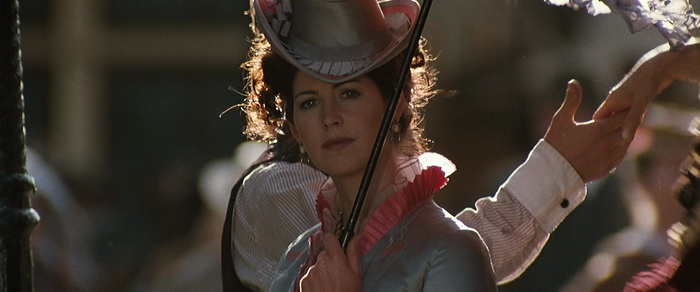 Bon, depuis, Kurt Russell aurait révélé qu’il aurait en réalité réalisé une grande partie du métrage à la place de Cosmatos, qui lui même arriva en urgence pour remplacer Kevin Jarre, réalisateur au départ de l’aventure, qui réalisé les scènes de Charlton Heston avant de quitter le projet, refusant de couper son scénario jugé trop long. C’est le bordel en effet, et Tombstone a tout pour être le film bancal. Et si on le compare à ce qui sortait au cinéma ses années là, forcément, la comparaison est rude, Eastwood avait signé Impitoyable l’année précédente. Tombstone n’est pas un western crépusculaire, il tente de nous montrer les événements ayant mené à la fameuse fusillade d’O.K. Corral, qui a eu lieu le 26 Octobre 1881. Une reconstitution donc des événements. Soyons clairs, Tombstone n’est pas un grand western. Il manque parfois d’ampleur, parfois de subtilité, sa dernière partie est même un peu aux fraises, avec quelques fusillades simplement ratées et qui donnent un côté étrange au métrage, comme lorsque Earp se lève avec son fusil, peut être facilement abattu par tout le monde, mais juste car il a la rage de vaincre, s’en sort vainqueur. Mais tout ce qui précède tiens plutôt bien la route. On a forcément du drame, de la romance, de l’action, et même quelques thèmes intéressants. Le personnage de Earp, campé par Kurt Russell, fait face à des dilemmes intéressants, alors qu’il cherche juste à se poser avec sa femme, et se retrouve face à un gang. Y a-t-il une différence entre tuer pour la justice et tuer pour la rétribution ? Où est la frontière entre le bien et le mal ? Car si les frères Earp et le Doc Holliday sont clairement les « gentils » de l’histoire, ils n’apparaissent pas intégralement comme étant tout blancs tout le long du film, forcés à faire par la suite des choix. Et bien entendu, il y a une histoire d’amour dans le métrage, mais elle ne domine jamais l’histoire, fort heureusement, étant plutôt en toile de fond et ne se faisant jamais envahissante.