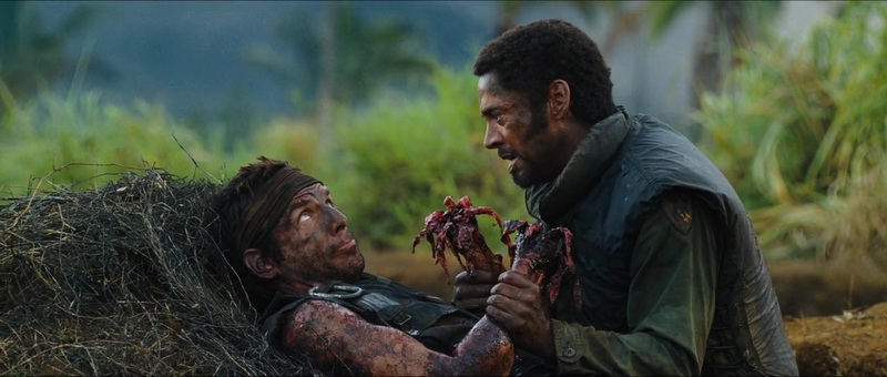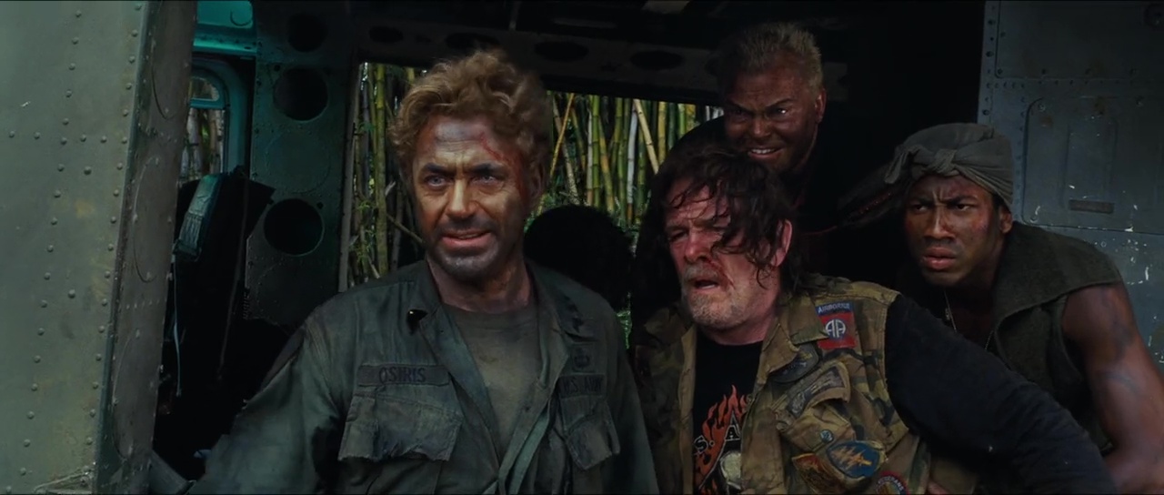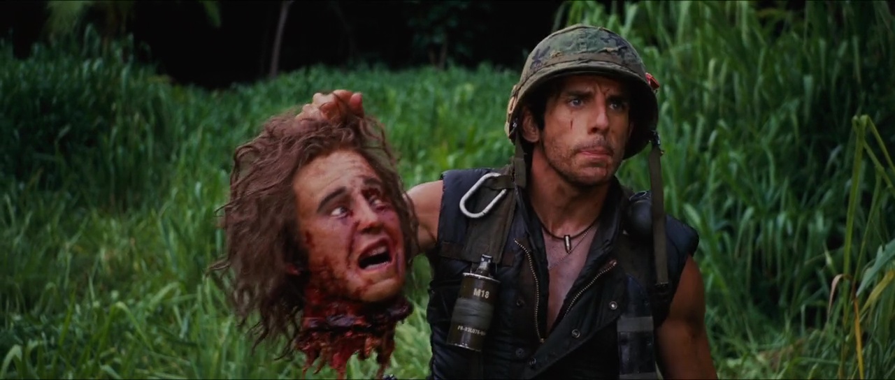 Il y a peu, je vous ai parlé de mon amour pour le film Dodgeball, avec Ben Stiller dans le rôle principal. Et bien histoire de vous prouver une nouvelle fois que quand je le veux, j’ai de l’humour, me voici à vous parler après une énième vision de Tonnerre sous les Tropiques. Une comédie de Ben Stiller, avec Ben Stiller et un casting 4 étoiles voir bien plus au final, des hommages, des parodies, des clins d’œil dans tous les sens, et le clou du spectacle, une critique d’un certain milieu, celui du cinéma bien entendu, le tout avec en guest star Tom Cruise, méconnaissable et absolument énorme dans son rôle. Tropic Thunder, c’est l’histoire d’un tournage, celui d’un film de guerre, le film de guerre le plus couteux de l’histoire du cinéma, avec un casting de stars qui ne se prend absolument pas pour de la merde, un producteur qui ne voit que par l’argent, et un petit réalisateur anglais qui a bien du mal à gérer tout ça, son tournage, ses vedettes. Et cela m’a fait énormément plaisir en lisant un peu partout que le rôle du réalisateur en question, joué par Steve Coogan, était fortement inspiré de l’expérience de Richard Stanley, qui se fut virer après quelques jours en 1996 du tournage de l’île du Docteur Moreau. Plaisir déjà car l’influence était à mes yeux voyantes lorsque l’on connaît les dessous de l’affaire, et surtout car si vous me lisez un peu, vous savez que j’aime beaucoup Richard Stanley, que ce soit son Hardware, Dust Devil ou récemment Color out of Space. Et le film nous explose au visage ces intentions dés la scène d’ouverture, le tournage d’une scène à grand spectacle, occasion donc pour Tropic Thunder de nous montrer en l’espace d’une scène un côté visual ultra léché, une bande son rock, des hommages en pagaille (histoire de le citer, bien qu’il est tellement voyant, Platoon, sans oublier pour le napalm Apocalypse Now), et un portrait du monde du cinéma qui ne plaisante pas, le tout porté par un casting en or.