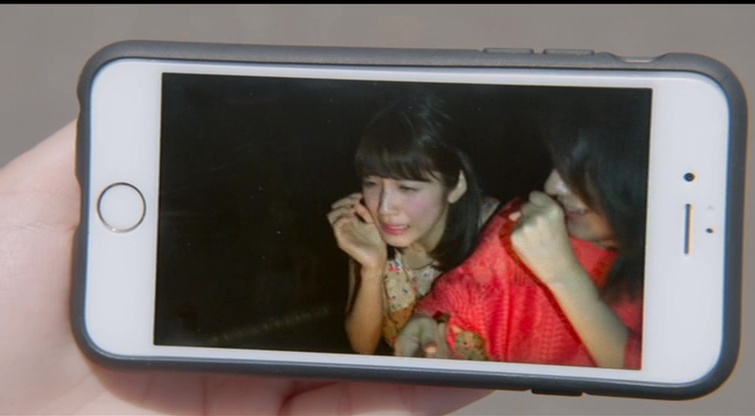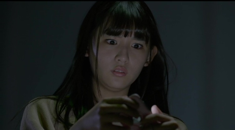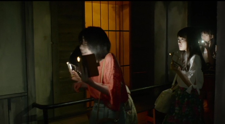 Malheureusement, on ne va pas y aller par quatre chemins, Toshimaen commence mal, avec cette bande de jeunes dans le fameux parc d’attraction en pleine nuit, qui se filme et diffuse tout ça sur internet, ce qui justifie donc la caméra qui tremble, les flous, et inonde l’écran de commentaires qui défilent. Je suis méchant oui, mais heureusement, ça ne dure qu’une poignée de minutes, avant que l’on ne fasse la connaissance de nos jolies idoles, menées par Saki (Kitahara Rie, 30 ans cette année, vue dans la blague gore Rise of the Machine Girls dont j’attend la sortie, et ancien membre de… AKB48). Au casting donc, Kitahara Rie oui, mais aussi Kojima Fujiko (mignonne comme tout, et avec une carrière déjà plus consistante, comme Fatal Frame ou Lesson of the Evil, malgré son premier rôle dans… Oppai Volleyball), Asakawa Nana (membre du groupe Super Girls, et vue au cinéma dans les deux sympathiques Black Maiden), Matsuda Ruka que je ne connais absolument pas, Saito Nari qui débute sa carrière au cinéma et Komiya Arisa bien plus habituée à jouer dans des Sentai. Niveau idoles, on est servis, ça oui. Est-ce qu’elles jouent bien ? Pas forcément. Est-ce que c’est une catastrophe ? On a vu bien pire, mais il faut bien reconnaître que pour le coup, elles ne sont absolument pas aidée par le scénario, et surtout par les personnages. Car des soucis d’écriture, il y en a un paquet ici, si bien que dés qu’un danger pointe le bout de son nez, nos idoles se recroquevillent sur elles-mêmes comme des enfants de primaire et que leur première idée sera de prendre leur téléphone pour appeler leur mère. Oui, des étudiantes à l’université qui régressent mentalement quand le danger est là, c’est possible. Il ne faudra du coup pas forcément attendre un maximum de réactions intelligentes dans le métrage. Et si l’on sait qu’une bonne ambiance peut sauver un scénario banal voir bancal, ce n’est pas le cas ici.