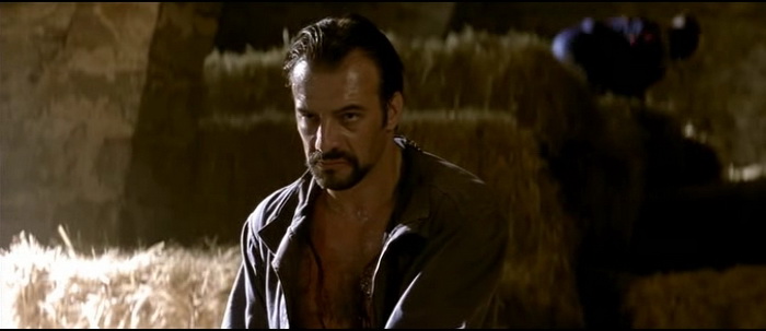 On va avoir droit à de bonnes grosses fusillades, essentiellement dans la deuxième partie avec un long final où ça tombe comme des mouches. Eric Rochant s’applique tout particulièrement pour rendre ces gunfights dynamiques, lisibles, violents, bourrins, intenses, et y parvient aisément, sans utiliser d’artifices, juste en allant à l’essentiel, avec des cadrages parfois malins, et une excellente utilisation du cadre de l’action, cette ferme et ses extérieurs, sans que jamais il y ait cette impression de redondance. Rochant cribles les corps de ses acteurs de balles, à grands renforts d’effets sanglants à l’ancienne, (crâne ouvert avec cervelle apparente, impacts de balles sanguinolents, …) pour un rendu renvoyant parfois au cinéma de John Woo période The Killer / Le Syndicat du Crime, sans jamais pour autant également la virtuosité de Woo. Ça se met joliment sur la gueule, à grands coups de poings et de tête, mais aussi de flingues et de grenade. C’est sans concession, bien violent, ça ne se refuse pas grand-chose, et le massacre final est tout bonnement jouissif. Alors c’est certain qu’avec Total Western, la frontière est mince entre ceux qui vont trouver ça jouissif et ceux qui ne vont y voir qu’une bobine ridicule. Les acteurs sont sans cesse à la limite de l’autoparodie, les répliques sont sans cesse à la limite du nanar, le film n’a clairement pas l’ambition de ses moyens, le second degré est employé sans aucune finesse, le scénario aligne tous les poncifs du genre. C’est très souvent le problème de ce genre de film qui se la joue décomplexé et fun. Il suffit d’ailleurs de jeter un œil aux critiques sur Allocine ou SensCritique pour s’en persuader. Mais si on le prend pour ce qu’il est, on passe un moment truculent où le risible côtoie le génial, où l’amateur de polar hard-boiled en aura pour son argent avec en plus tout un tas de répliques improbables qui font mouche.