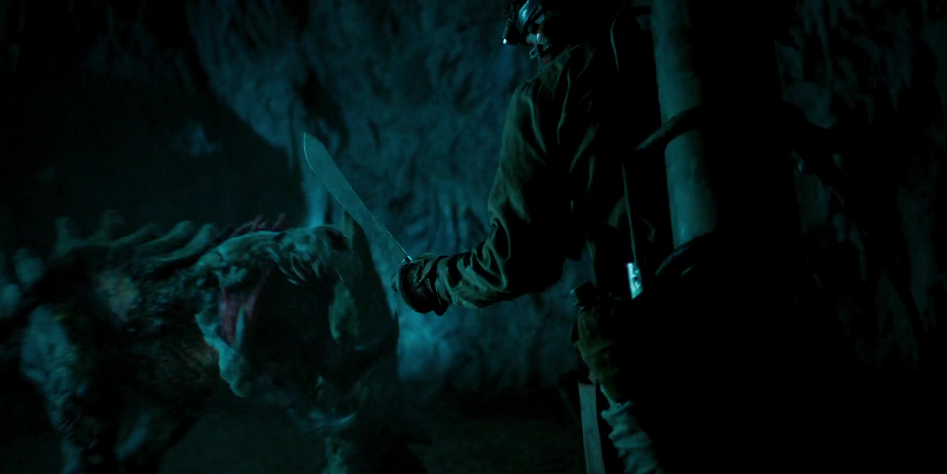 Le reste du métrage, comme l’ensemble de la saga finalement, ne se prend pas réellement au sérieux. Tant mieux vous me direz. Burt en fait des tonnes, étale sa connaissance en armes à feu et en survie. Face à lui Richard Brake en fait toujours des tonnes et nous lâche son fameux rire, les créatures sont souvent présentes et comme c’est de coutume depuis le cinquième opus, ils sont majoritairement en CGI, mais les incrustations sont pour la plupart réussies et les effets passent clairement. Le rythme est plutôt bien géré, et on suit l’aventure avec son côté bon enfant, ses multiples références. Voir Burt et son nouvel acolyte vouloir se la jouer Predator et Evil Dead dans une grotte, c’est plutôt fun au final. Même si une fois sur deux, quand le film veut se montrer bad ass, il échoue, sans doute la faute à un budget trop faible pour les ambitions. Mais on retiendra par contre sa générosité, dans ses nombreuses attaques, dans son rythme, son ton léger, et l’ensemble du casting semble s’amuser. On regrettera par moment la facilité, notamment à cause de l’auto citation, et la reprise de certains éléments venant de la première partie de la saga, des épisodes 1 à 4, mais le métrage parvient in extremis à se justifier dans ces derniers instants. Un peu tardivement ? C’est vrai oui, mais cela permet de conclure ce nouvel épisode de manière positive. Encore un nouvel opus oui, tardif, pas extraordinaire comme beaucoup d’opus depuis le 3, mais sympathique.