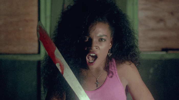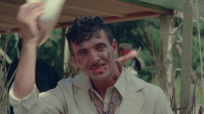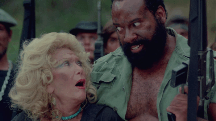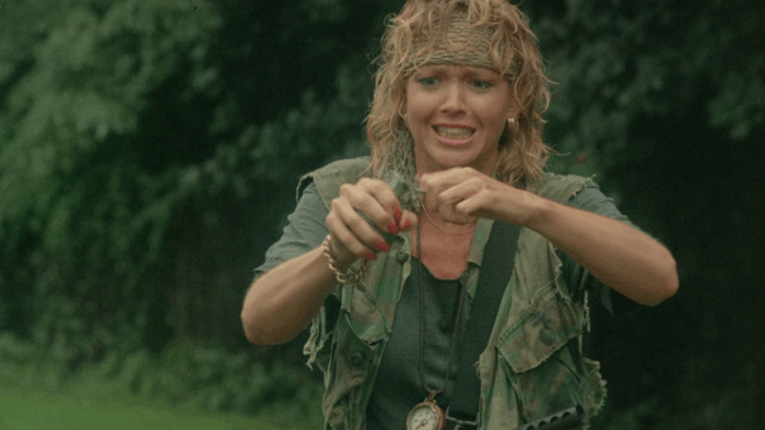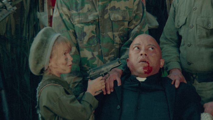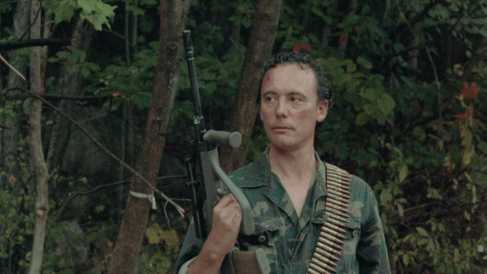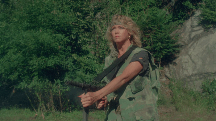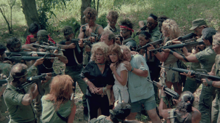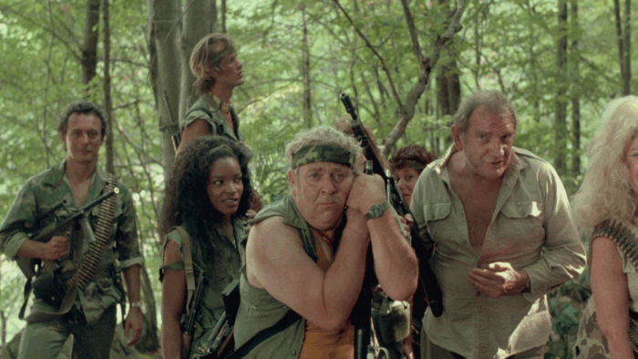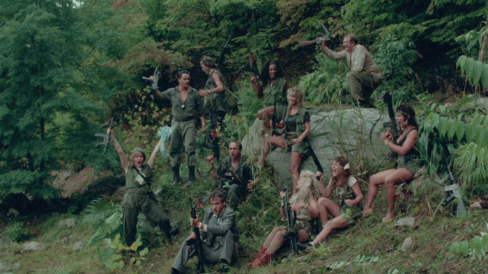 Troma’s War est donc la réponse de la Troma au cinéma d’action Reaganien des années 80, les Rambo 2 et autres productions Cannon. Ici pas de héros qui part refaire la guerre du Vietnam à lui seul pour la gagner ou qui repousse l’envahisseur et sauve une Amérique belle et triomphante, mais les survivants d’un crash aérien qui sont autant de personnages caricaturaux : le beau gosse, une retraitée, un prêtre, une aveugle, une femme avec son bébé, une demoiselle en détresse, un homme d’affaire… mais aussi un groupe de glam rock, un anglais pas très loin d’être un agent secret ou encore un vétéran du Vietnam cinglé. Tous vont se retrouver malgré eux à défendre l’Amérique d’un commando de psychopathes qui veulent renverser le système et prendre le pouvoir des USA. Il y a beaucoup de personnages dans Troma’s War, trop au départ, mais le film se débarrasse du superflu dans une première partie qui s’apparente à un survival aux idées parfois trash et de mauvais goût comme Señor SIDA, violeur en charge de monter une armée de sidéens. Un survival dans lequel l’action n’est jamais loin, Troma’s War ne perdant jamais de vu le genre auquel il veut appartenir. Le film bascule dans sa seconde partie dans le pur film de guerre où ça défouraille non stop dans un final à l’image du reste : trop ambitieux et chaotique.