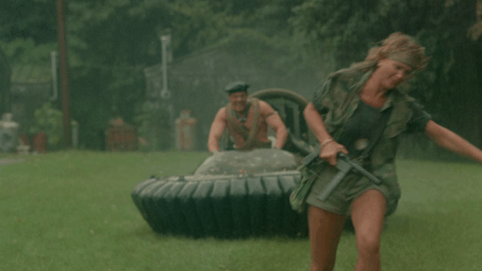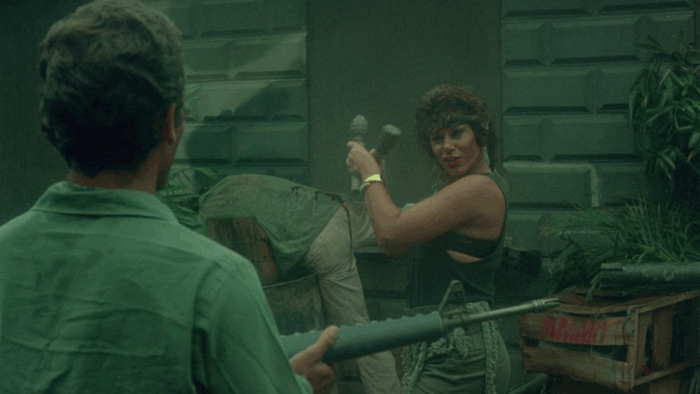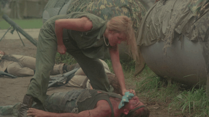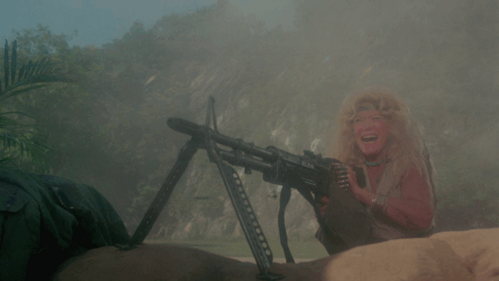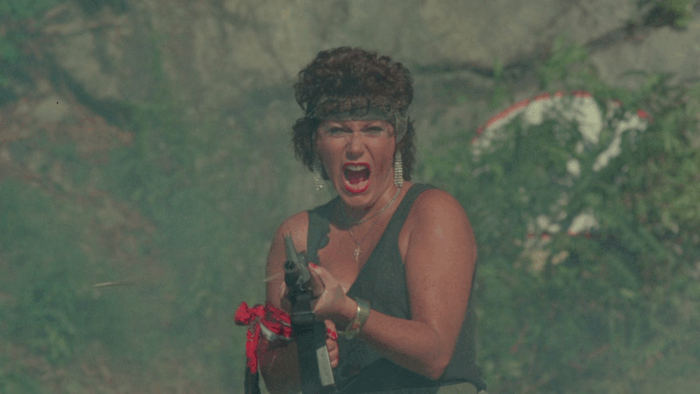 Les scènes d’action sont un bordel à tous les niveaux, les faux raccords sont nombreux, les figurants font semblant de tirer et tombent quand la caméra passe l’objectif sur eux, le manque de moyen se fait ressentir à chaque plan, les cascades et explosions sont réalisées avec autant de sécurité qu’une production tournée aux Philippines et les effets spéciaux sont d’un amateurisme incompréhensible venant de la part de Pericles Lewnes, qui avait pourtant montré son savoir faire avec trois bouts de ficelles dans Redneck Zombies. C’est dans ce chaos que Troma’s War prend tout son sens, Lloyd Kaufman n’oublie pas qu’il tourne un film de guerre avec une volonté et une sincérité qui se ressent, pas plus qu’il revisite un sous-genre qu’il accommode à sa sauce. Si le film se savoure comme un plaisir régressif que livre ce genre de métrages, on reste dans un Troma avec ce que ça apporte comme plans improbables, de détails plus ou moins volontaires dans l’arrière plan, idées barges, humour là aussi plus ou moins volontaire et scènes qui se regardent un sourire en coin devant un spectacle si bourrin et crétin qu’il en devient fun. Mais Lloyd Kaufman ne fait pas que de parodier le sous-Rambo, il le prend à contre-pied. En plus des personnages aussi caricaturaux qu’attachants qui n’ont rien à faire là, le réalisateur efface la testostérone propre à ce genre en mettant les femmes au centre de l’action. Troma’s War en devient une œuvre féministe dans laquelle Lloyd Kaufman dénonce également l’absurdité de la guerre, tape sur le Reaganisme et bien sûr sur tout un sous genre dont il souligne les tares en les exacerbant, auquel il apporte un rejeton malformé, fou et fun. Du grand Troma.