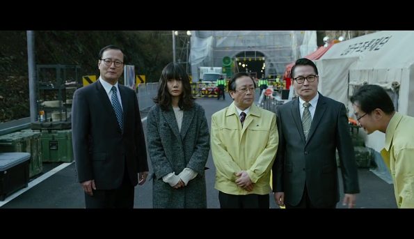 Ici, Lee Jung-Soo est seul dans sa voiture, rencontrera assez rapidement une autre survivante bloquée elle aussi dans sa voiture, et doit survivre avec ce qu’il a en attendant les secours. Oui, monsieur n’a avec lui que deux bouteilles d’eau qu’il a eu la chance de récupérer à la station service lors de la scène d’ouverture, et un gâteau car c’est l’anniversaire de sa fille. Et bien entendu, son téléphone pour communiquer avec le monde extérieur, tout en faisant attention à sa batterie. Et même lorsque les secours prennent du temps, lui donnent une date lointaine (au bout de quelques jours : bon ça va prendre 10 jours pour forer), Lee sait rester réaliste et avant tout humain. Il partagera même son eau avec l’autre survivante, et on aura même droit au cliché du…chien enseveli avec nos personnages. Ce qui permettra au réalisateur d’amener un peu d’humour (le partage du sachet de croquettes), en laissant au placard ce qui faisait peur. Oui, dans le film, il ne s’agira pas de sauver le chien, le personnage l’enverra même bouler plus d’une fois. Et en dehors du tunnel ? Et bien on ne peut pas dire que le film dresse un beau portrait des sauveteurs, la plupart perdant très rapidement espoir, tandis que les hauts dirigeants eux pensent plutôt à leur porte monnaie.
