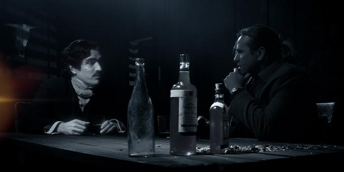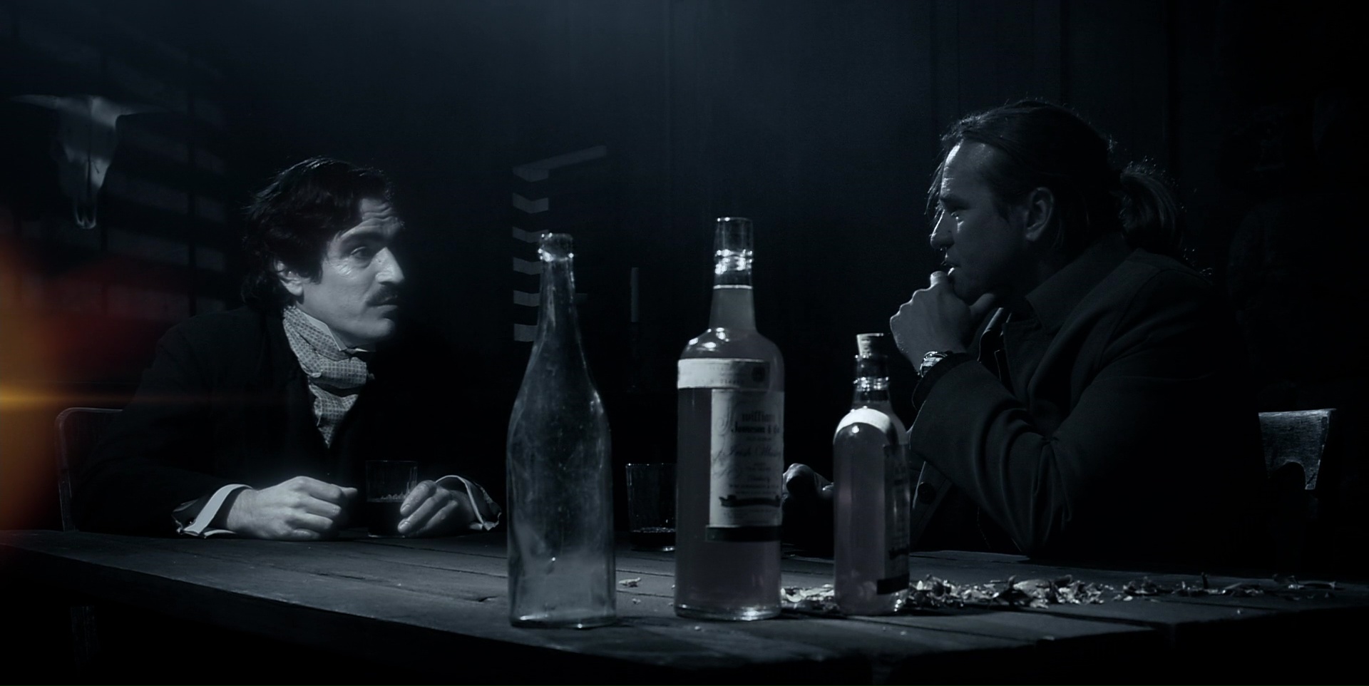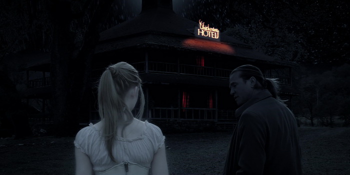 Et Twixt, autant narrativement que visuellement, va un peu tenter tout et n’importe quoi donc. Déjà narrativement, c’est difficile à suivre et à expliquer, le film mélangeant de manière simple, du moins au début le rêve et la réalité, avant de briser tardivement ses différentes frontières. On se demande en tout cas souvent où Coppola veut en venir. Mais il y a surtout le visuel, là où ça a coincé pour beaucoup. Coppola a tourné son film en numérique, et a utilisé de très lourds procédés en post production pour altérer l’image. Si quand le film se déroule de jour et nous présente les recherches de Hall (ou la scène très comique où il essaye d’écrire la première ligne du roman), ça a un côté assez brut de décoffrage (ou moche, selon certains, mais je n’irais pas jusque là), dés que le film passe de nuit, et donc dans le monde des rêves, ça se laisse aller à tous les excès, entre les filtres, le noir et blanc très contrasté, le maquillage des acteurs, les incrustations numériques dégueulasses de partout. Et pourtant, ça a un certain charme qui ne m’a pas laissé indifférent. Soyons clairs, certaines images sont dégueulasses, certaines idées à la limite du nanar (la lune moustachue ?), et malgré des scènes amusantes ou d’autres très réussies, Twixt reste un film obscur. Trop plein d’idées. Mais oui, à côté de ses catastrophiques ratages, il y a de bonnes choses. Les acteurs déjà sont très bons pour la plupart, le cadrage ose parfois sortir des sentiers battus pour proposer des cadrages originaux qui marquent la rétine, et si l’usage de filtres et autres sont très (trop) nombreux, cela donne à certaines scènes un feeling assez unique qui ne m’aura pas déplu. Sans doute que si Twixt avait été le premier film d’un artiste inconnu, on aurait pardonné plus facilement ces ratages. Car les ratages sont nombreux et assez abyssaux. Mais de mon côté, il y a aussi des hauts, et Twixt parvient à être presque touchant dans ses plantages. Du coup oui, j’ai aimé. Mais ça ne veut pas dire que le film est bon.