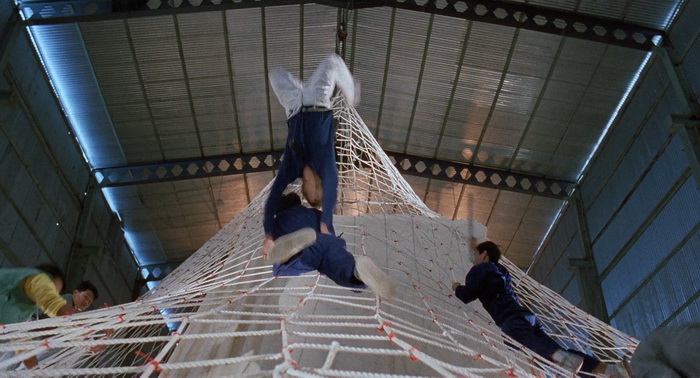 Ces scènes d’action sont de très bonne tenue, le duo Mang Hoi / Corey Yuen arrivant sans problèmes à tirer le meilleur parti des artistes martiaux du film. Les chorégraphies dans un pur style de cette époque, rapides, nerveuses, souvent brutales, avec des cascadeurs qui en prennent plein les dents et qui se balancent sur tout ce qu’ils peuvent. C’est souvent inventif, avec des mouvements parfois très complexes qui semblent pourtant si faciles à réaliser par le casting. Et c’est clairement l’attraction principale du film. Rien que la première scène avec Cynthia Rothrock en train de dérouiller une 20aine de sbires dans une usine, en grande partie sur un échafaudage en bambous, vaut le visionnage, avec cette folie (ou cette inconscience, c’est selon) qui caractérise le cinéma de Hong Kong de cette époque. L’affrontement bien brutal entre Chin Siu-Ho et Billy Chow et le long final en plusieurs parties impliquant entre autre un excellent Jeff Falcon (The Inspector Wears Skirt) sont eux aussi de très haute volée. Le casting est éminemment sympathique pour qui aime un tant soit peu le ciné HK de cette époque avec des noms tels que Mang Hoi, Tai Bo, Wu Ma, Chin Siu Ho, Melvin Wong et Roy Chiao (tous deux déjà présents dans le premier film) ou encore Billy Chow et sa tête de tueur. A noter la présence du réalisateur Ronny Yu (Bride With White Hair) dans le rôle du grand méchant patron sadique. Mais tous ne sont pas très bons à l’instar de Cynthia Rothrock qui est clairement meilleure combattante qu’actrice.