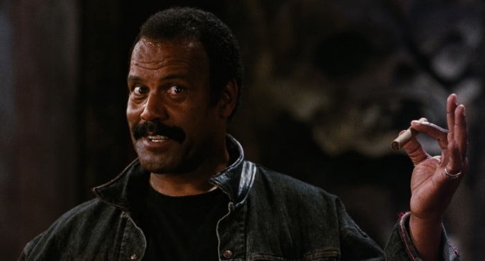 La première partie du film n’a pourtant rien d’exceptionnel, une classique cavale de deux frères qui viennent de dévaliser une banque et qui vont se cacher dans le camping-car d’une petite famille afin de traverser la frontière mexicaine. Mais lorsque la deuxième partie se lance à l’arrivée au fameux Titty Twister, le film par en cacahuète total pour devenir un bon gros délire gore et ultra jouissif. Là, le film tombe dans la bisserie avec du sang, des boobs, des jurons, des armes, des membres coupés dans tous le sens. C’est complètement idiot mais extrêmement régressif avec un côté frénétique qui fait sautiller l’amateur sur son canapé. A l’origine, ce massacre final ainsi que les scènes de combats qui la composent étaient plus longs et beaucoup plus gores, mais certaines scènes ont dû être raccourcies et du sang vert a été utilisé pour les vampires afin que le film passe la censure. Mais malgré cela, les amateurs de sanquette qui tâche, de maquillages dégueulasses et autres délires bien portenawakesques en auront pour leur argent. Le travail sur les effets spéciaux est à saluer tant certains effets gores sont bien fichus et ça fourmille d’idées dans tous les sens, à commencer par cette guitare faite entièrement de membres humains. Certes, les quelques CGI ont vieilli mais ils sont malgré tout raccord avec le côté série B du film. Une Nuit en Enfer est bourré de références, du Assaut de Carpenter le temps d’un Precinct 13 inscrit sur un T-Shirt, à la saga vidéoludique Castlevanie lorsque Tom Savini tue des vampires avec un fouet, en passant par Bad Taste lorsque le personnage de Jacob tire à travers le corps d’un vampire a plusieurs reprises. Mais il y en a bien d’autres : Django, Maniac Cop 2, Pulp Fiction, Desperado, Indiana Jones et le Temple Maudit, … au point que ça en devient ludique d’essayer d’en voir le maximum. Alors oui, le scénario est au final très léger, ne reposant que sur son concept de la 2ème partie, et les personnages sont aussi profonds qu’une poêle à crêpes, mais qu’importe, le divertissement est là et si on accroche au délire, on ressort avec une banane pas possible, avec la bande originale du film qui nous trotte dans la tête pendant plusieurs jours.