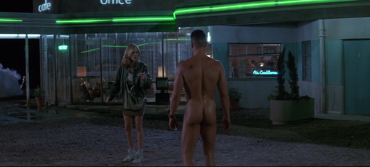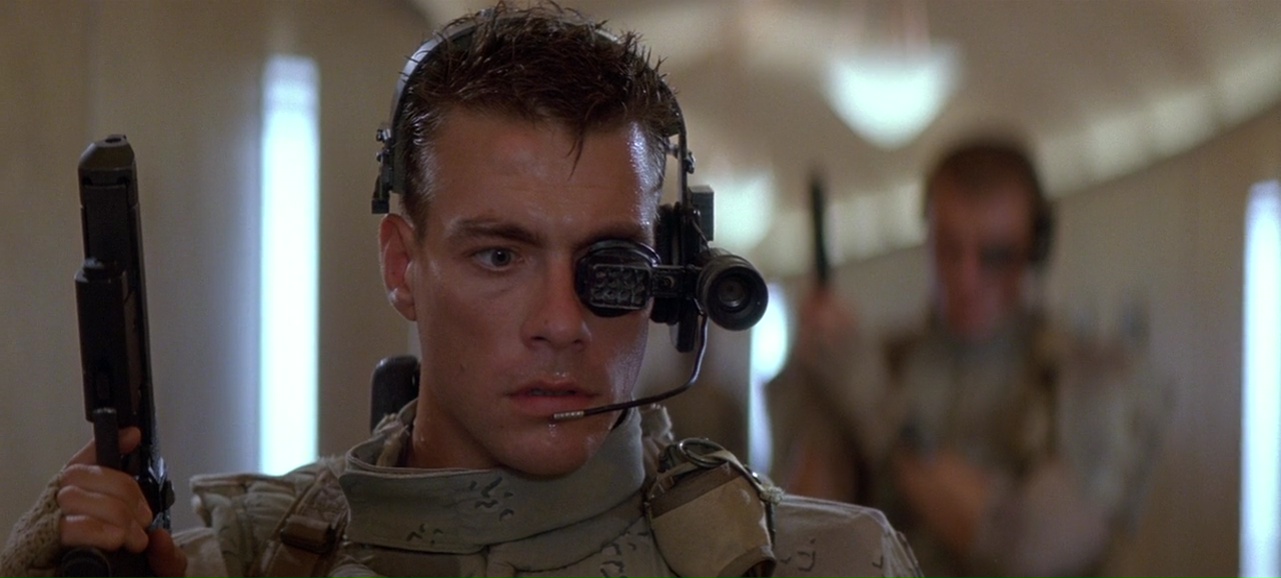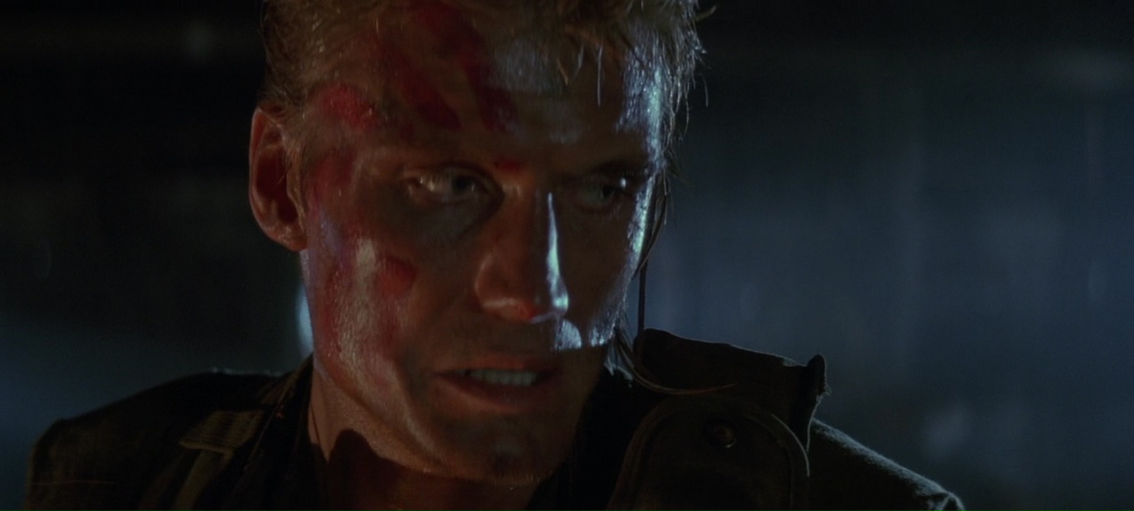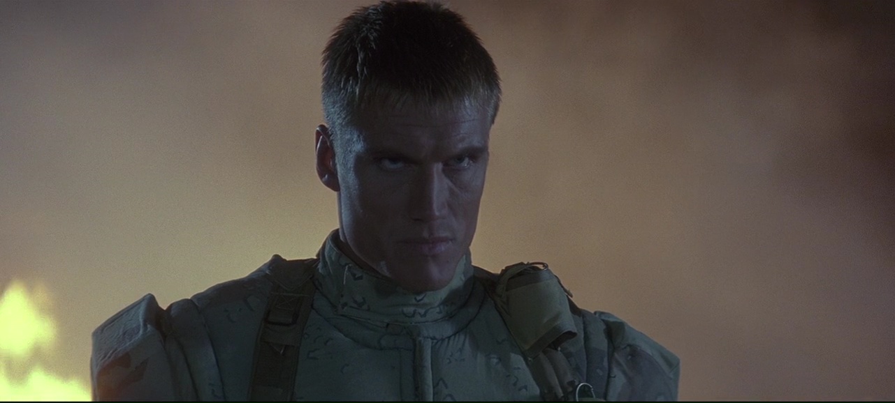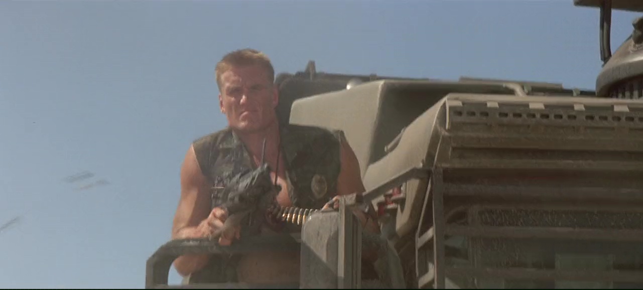 À partir de là, le film se transforme en gigantesque course poursuite, avec les moyens de bord (22 millions de budget on rappelle), qui tient plutôt bien la route, entre rythme, moments bien violents (Lundgren pète souvent les plombs), moments assez ridicules (Van Damme à poil dans un motel qui doit recharger ses batteries), mais qui fait sourire et qui a ce pouvoir de divertir avec simplicité, sans tenter d’en faire trop (ce qui sera bien souvent le défaut de Roland Emmerich par la suite). Ici, il se contente de livrer un film d’action rentre-dedans assez simpliste une fois son concept exposé, et pas plus. On peut regretter qu’apparemment, le ton ai été adoucit, à la fois comparé au scénario original (qui était très critique envers l’armée) et comparé au premier montage (la fin alternative présente sur le DVD montre un final tout aussi violent, mais au ton bien plus sombre). Mais il y a clairement quelque chose d’attachant dans le spectacle assez insouciant que nous propose le réalisateur Allemand. Ce n’est pas encore totalement pyrotechnique, ça ne se prend pas totalement au sérieux comme le prouve la scène du Dinner où Van Damme peut se lâcher et faire du Van Damme à coup de coups de pieds retournés dans la face. Et puis il y a Dolph Lundgren qui vole le show et semble s’amuser comme un gamin alors qu’au départ, il en avait marre de jouer les méchants et avait auditionné pour le rôle du héros. Il est over the top, tout le temps, même quand il nous sort un rire de grand méchant, qu’il doit tuer des innocents, ou en pleine course poursuite en lançant des grenades comme un petit enfant. Ce côté over the top, au sein d’un film qui ne se prend pas la tête même si on peut y voir des restes de la critique de l’armée, et bien ça fait plaisir, et ça fait passer le métrage malgré ses nombreux défauts, et son scénario aux emprunts parfois gros (réfléchissez un instant et rappelez-vous que Terminator 2 date d’un an avant).