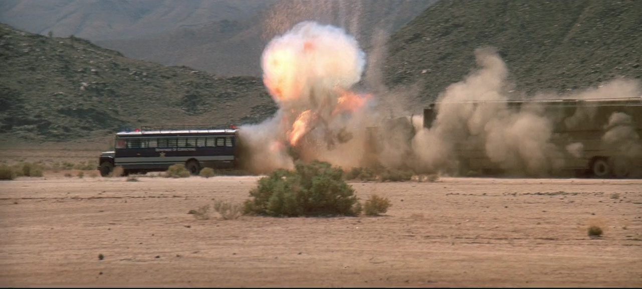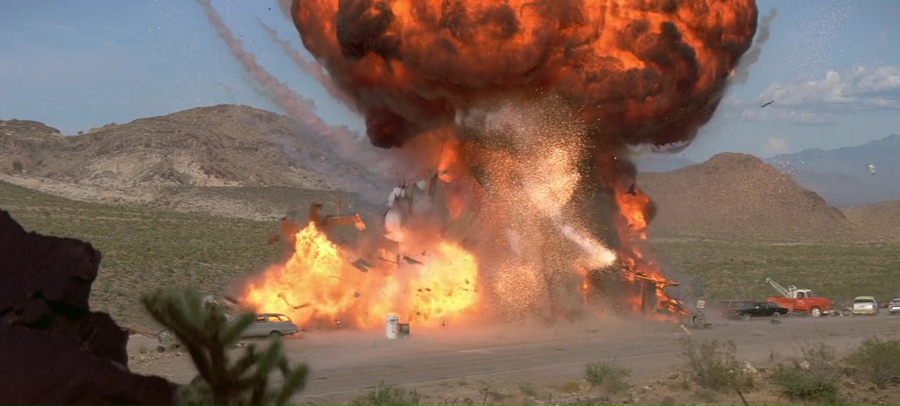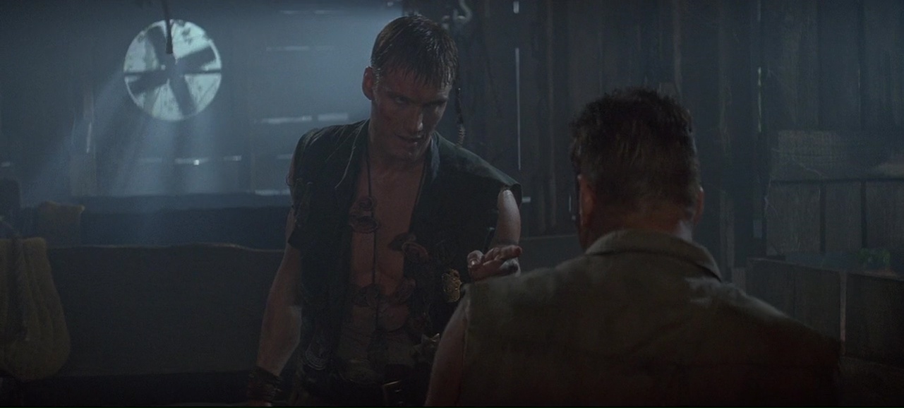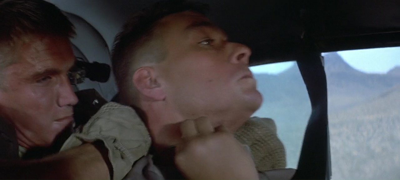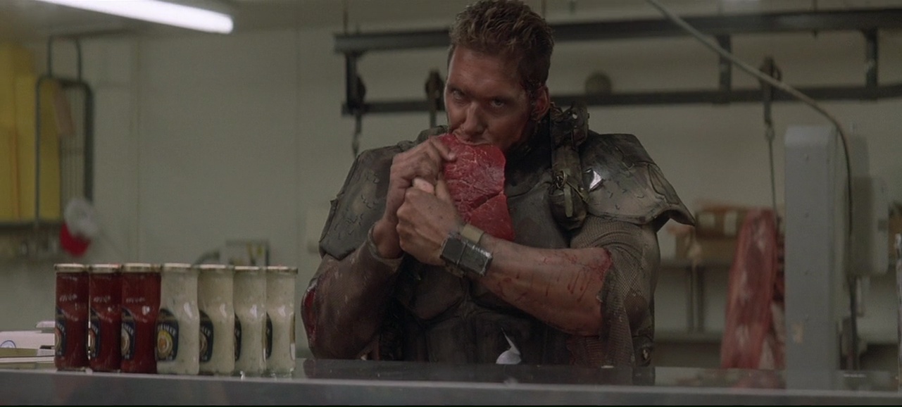 À partir de là, le film se transforme en gigantesque course poursuite, avec les moyens de bord (22 millions de budget on rappelle), qui tient plutôt bien la route, entre rythme, moments bien violents (Lundgren pète souvent les plombs), moments assez ridicules (Van Damme à poil dans un motel qui doit recharger ses batteries), mais qui fait sourire et qui a ce pouvoir de divertir avec simplicité, sans tenter d’en faire trop (ce qui sera bien souvent le défaut de Roland Emmerich par la suite). Ici, il se contente de livrer un film d’action rentre-dedans assez simpliste une fois son concept exposé, et pas plus. On peut regretter qu’apparemment, le ton ai été adoucit, à la fois comparé au scénario original (qui était très critique envers l’armée) et comparé au premier montage (la fin alternative présente sur le DVD montre un final tout aussi violent, mais au ton bien plus sombre). Mais il y a clairement quelque chose d’attachant dans le spectacle assez insouciant que nous propose le réalisateur Allemand. Ce n’est pas encore totalement pyrotechnique, ça ne se prend pas totalement au sérieux comme le prouve la scène du Dinner où Van Damme peut se lâcher et faire du Van Damme à coup de coups de pieds retournés dans la face. Et puis il y a Dolph Lundgren qui vole le show et semble s’amuser comme un gamin alors qu’au départ, il en avait marre de jouer les méchants et avait auditionné pour le rôle du héros. Il est over the top, tout le temps, même quand il nous sort un rire de grand méchant, qu’il doit tuer des innocents, ou en pleine course poursuite en lançant des grenades comme un petit enfant. Ce côté over the top, au sein d’un film qui ne se prend pas la tête même si on peut y voir des restes de la critique de l’armée, et bien ça fait plaisir, et ça fait passer le métrage malgré ses nombreux défauts, et son scénario aux emprunts parfois gros (réfléchissez un instant et rappelez-vous que Terminator 2 date d’un an avant).