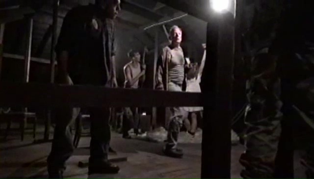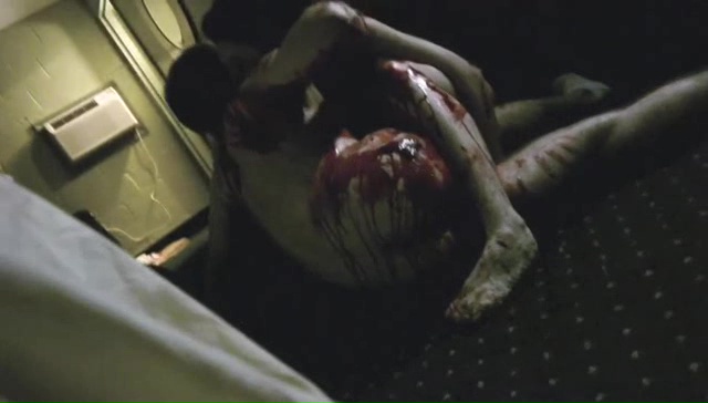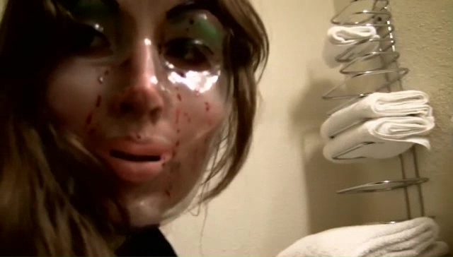 Oui, à la vision de ce fil conducteur, j’ai soupiré. Profondément. Mais comme il ne faut pas juger un film à sketch par la fine intrigue reliant le tout, je me suis accroché. Mais n’empêche, c’est filmé avec les pieds, et comme ça s’appelle V/H/S, la qualité d’image est dégueulasse ! Un rapide coup d’œil à ma collection de Blu-Ray, à la qualité d’image irréprochable, et je me plonge dans le premier sketch. Un certain David Bruckner réalise. Un coup d’œil sur le web, et je m’aperçois qu’il n’a fait que des sketchs pour des films ou des courts métrages. Par contre, il est prévu pour le reboot de Vendredi 13. Bon, heureusement, puisque son métrage est un des plus réussis de l’anthologie. Sans pour autant m’avoir convaincu. Oui, définitivement, le found footage et moi, ça fait deux. Je demande un minimum, comme quelques belles images, une caméra un minimum stable pour comprendre ce qu’il se passe. Ici, la caméra est en fait une caméra miniature placée sur les lunettes du personnage principal, qui va sortir pour draguer et ramener une jeune femme à l’hôtel avec ses amis. Donc forcément, dés qu’il baisse les yeux, dés qu’il tourne la tête, la caméra fait de même. Mes yeux en prennent un coup, mais je m’accroche pour découvrir une histoire finalement assez sympathique, avec quelques débordements sanglants, et une ambiance pas si mauvaise que ça. Oui c’est pas mal, si l’on passe outre la mise en scène finalement. Même si les V/H/S, ça fait chier, il y a toujours des sautes d’images lorsqu’il se passe un truc intéressant… ou des sautes d’images quand le réalisateur veut camoufler un défaut ou un manque d’argent. Mais ça passe, je suis lancé, passons au second sketch !