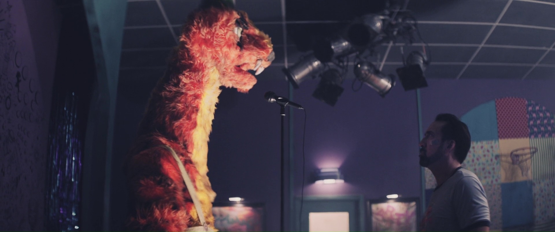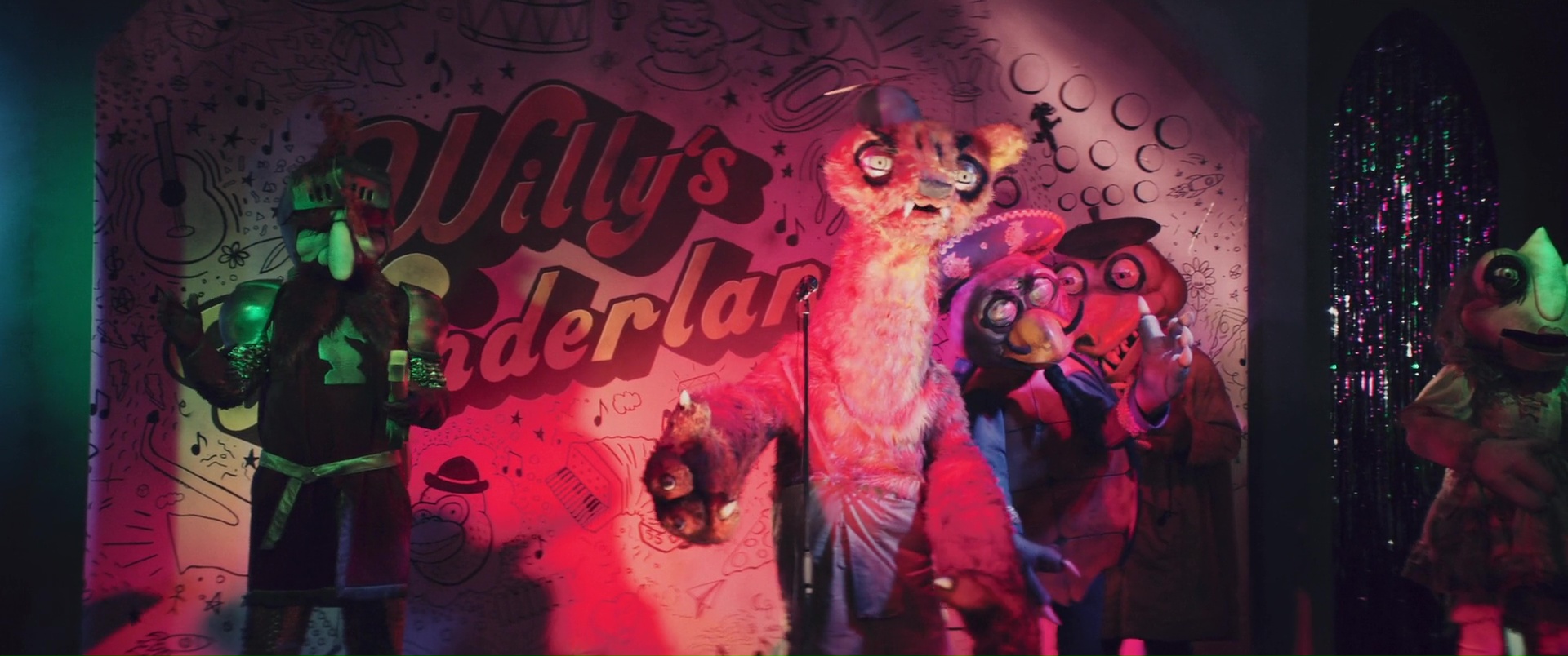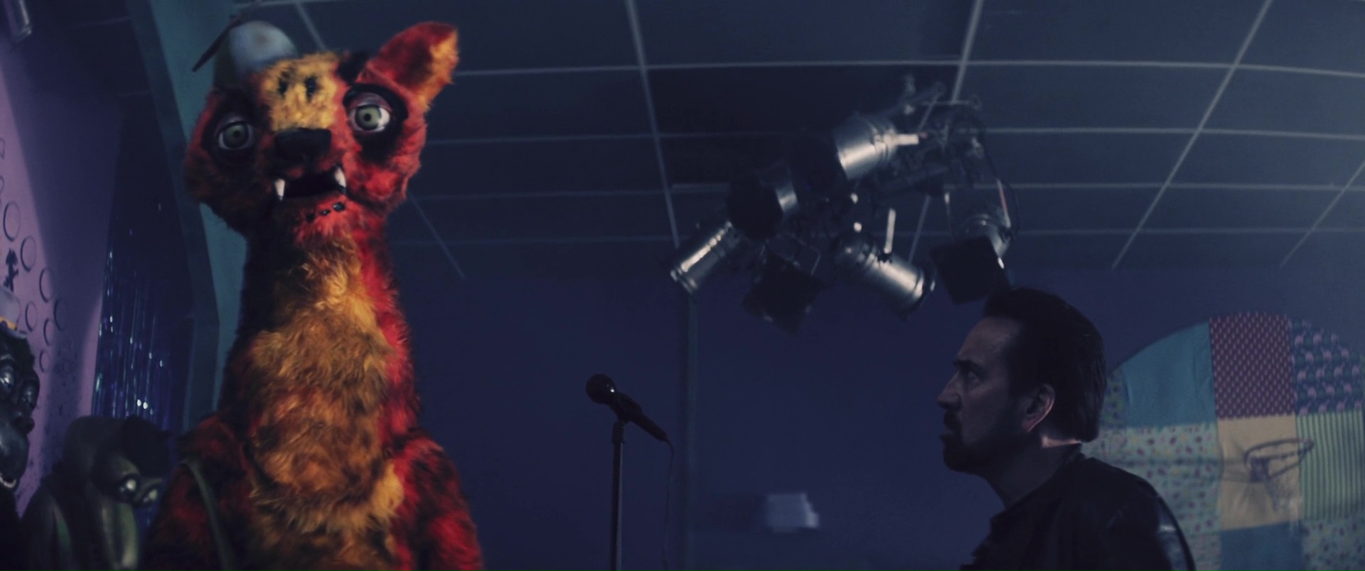 It’s Your Biiiiirthday, and we want you to have fuuuun ! It’s your biiiiiiirthday so let’s party everyooooone ! Hmmm pardon, je crois que je m’éloigne quelque peu du sujet. Enfin non, je suis un peu trop dans le sujet en fait. Alors, il se passe quoi quand G.O. Parsons, scénariste débutant signant son premier scénario pour un long métrage, et Kevin Lewis, réalisateur de seulement 7 autres films que personne ne connaît éparpillés entre 1996 et 2007 s’associent, trouvent Nicolas Cage comme acteur principal, et décident d’adapter non officiellement un beau jeu de merde, à savoir Five Nights at Freddy, le jeu à jumpscares putassiers par excellence, ça donne quoi ? Un film fun, pas prise de tête, et qui finalement, nous fait dire que Five Nights at Freddy, si l’on jouait Nicolas Cage, ce serait plutôt un rail shooter où l’on est armé de battes de baseball et où les méchantes peluches nous fuiraient plutôt que de faire des jumpscares tout pourris ! Alors, les ingrédients du jeu sont là. Un homme qui ne parle pas doit s’occuper d’un parc abandonné durant toute une nuit alors que des peluches géantes en animatronics qui prennent vie tentent de le buter. Mais pas de bol pour les peluches toute mignonnes et tueuses, c’est Nicolas Fucking Cage qu’elles ont face à elle, et le Cage, il ne rigole plus depuis des années, s’aventurant dans des projets et des rôles de tarés ce qui lui convient plus qu’à merveille (Mom & Dad, Mandy, Color out of Space). Du coup, comme un personnage le dira subtilement (frontalement) dans le film, ce n’est pas Nicolas Cage qui est enfermé avec des peluches tueuses ! Ce sont les peluches qui sont enfermées avec lui ! Voilà qui donne clairement le ton du métrage. Alors au programme, des chansons mignonnes, du fun, du second degré, un peu de néons pour la route, 7 ou 8 peluches variées, un Nicolas Cage muet (littéralement, il ne dira pas un mot de tout le film) qui va défourailler de la peluche, et surtout devoir boire une boisson énergisante pour avoir la pèche à intervalle régulier, bip de la montre en bonus pour lui rappeler.