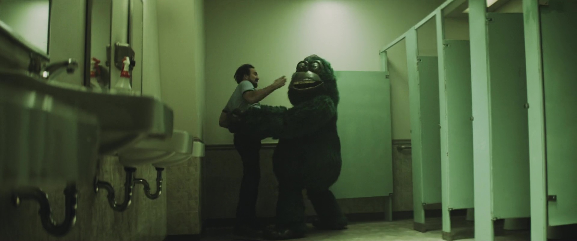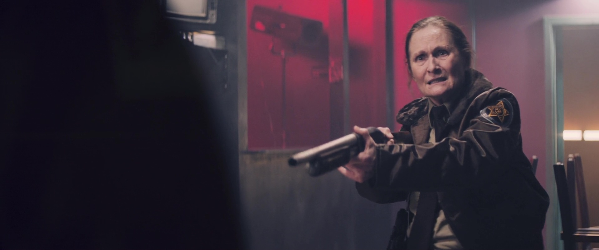 Car ce brave Nic, il n’a pas un grand but. Lui, il veut juste réparer sa voiture, et pour ça, on lui propose de nettoyer un vieux parc tout pourri pour enfants fermé depuis belle lurette. Et comme il n’a qu’une parole, il va le faire son boulot. Nettoyer, récurer, balayer. Dans le calme le plus total. Quand une peluche décidera de s’en prendre à lui, grand mal leur en prendra, car Nic, on le fait pas chier, lui il te défonce une peluche à coups de pieds, lui éclate la tête et les circuits imprimés contre le mur ou la cuvette des toilettes, avant de jeter le cadavre dans un sac poubelle et de reprendre son nettoyage comme si de rien n’était (et de changer de T-shirt, l’huile de moteur ça tâche). Voilà, c’est ça Willy’s Wonderland, ni plus, ni moins. Bon ok, pour tenir pendant presque une heure et demi, le film nous rajoute bien un peu de background, à base de tueurs en série qui sont réincarnés dans les peluches tueuses après un rite satanique, et une bande de jeunes qui rentre dans le bâtiment le même soir afin de sauver notre nettoyeur sans nom et brûler l’endroit, mais on se doute, ils vont tous périr les uns après les autres. Pourquoi ? Parce que ce sont des clichés sur patte, entre le peureux, celui qui craque pour la chef de la bande, la chaudasse et j’en passe. Nicolas Cage aurait tenu tous les rôles, personne ne serait mort ! Alors oui, Willy’s Wonderland, c’est clairement le film limité par son concept même. On a nos peluches sataniques, notre nettoyeur, une bande de jeunes, et aussi une shérif jouée par Beth Grant (Donnie Darko, son rôle m’a marqué à vie), un lieu unique, et voilà, on a un film. Le scénario n’évolue pas vraiment, la mise en scène n’est pas non plus excellente mais fonctionnelle. Et pourtant, que ça fait du bien. Willy’s Wonderland, c’est fun !